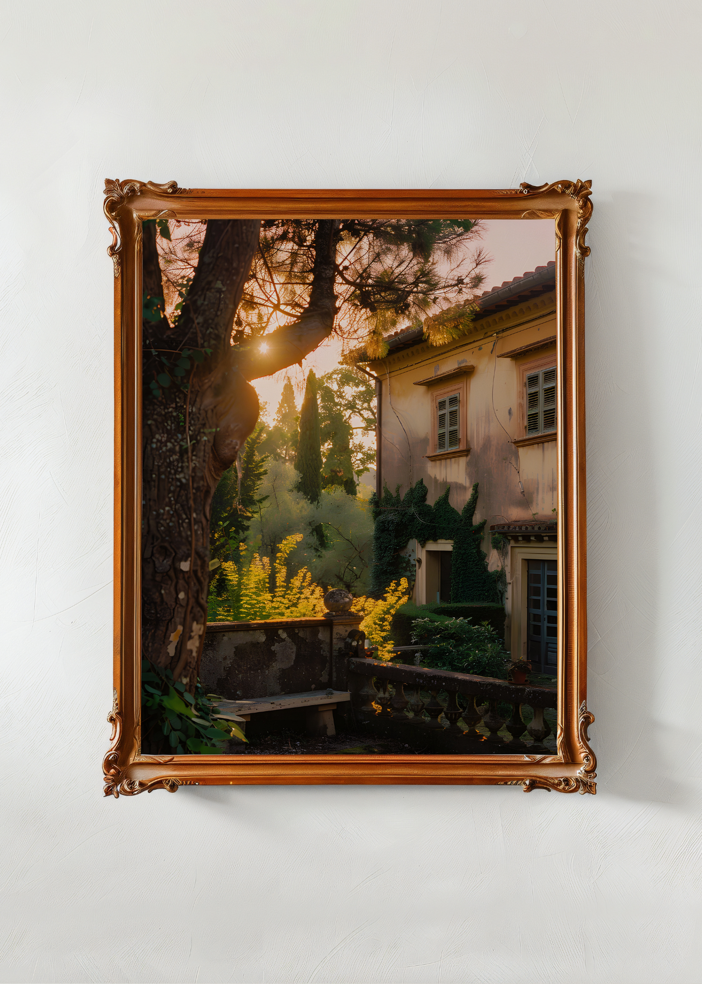 Golden Hour in the Garden— The last light of day filters through pine boughs and tangled ivy, brushing soft gold across an old stone bench and a vine-covered villa. Everything glows in that hush-before-evening way, where time holds still and beauty lingers. This print feels like stepping into a forgotten courtyard, one where secrets rest in the cracks and the sunset always arrives gently. Romantic, timeless, and kissed with light.