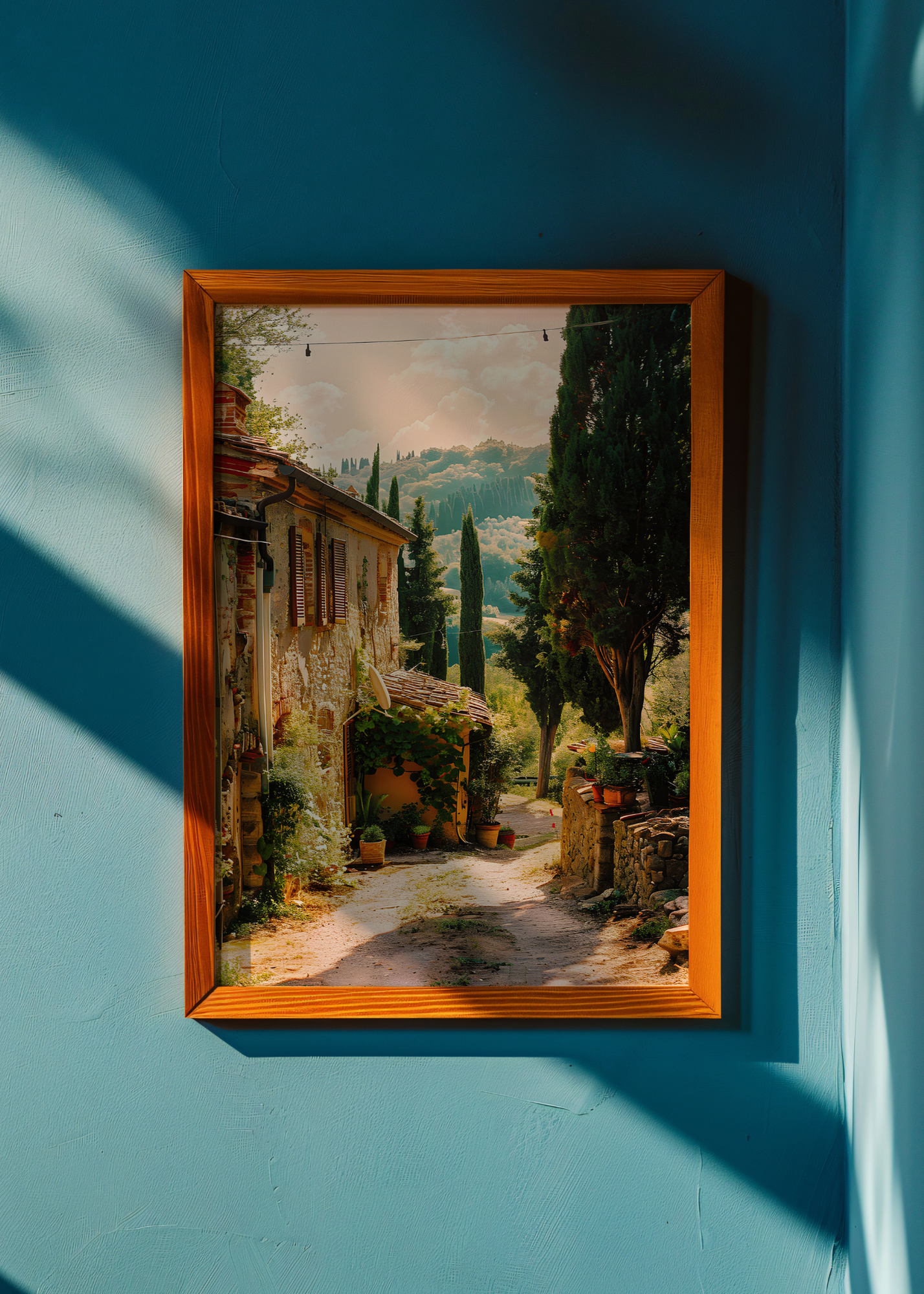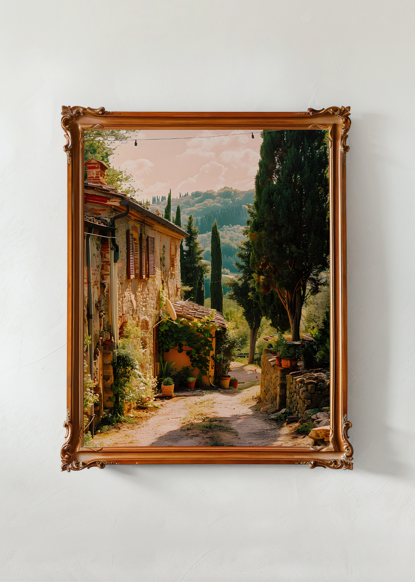 Tuscan Reverie— Soft terracotta walls and trailing vines invite you into the quiet embrace of a countryside afternoon. A narrow path winds through this sun-drenched village, where time seems to slow and life blooms in terra cotta pots and flower-laced windowsills. The rolling hills behind—dotted with cypress trees and kissed by a peachy sky—create a dreamy sense of depth and stillness. This print is a love letter to golden hour in Tuscany: to the hum of cicadas, to shared wine on back porches, and to the kind of peace you don’t realize you were craving until you find it. It brings timeless beauty to any space.
