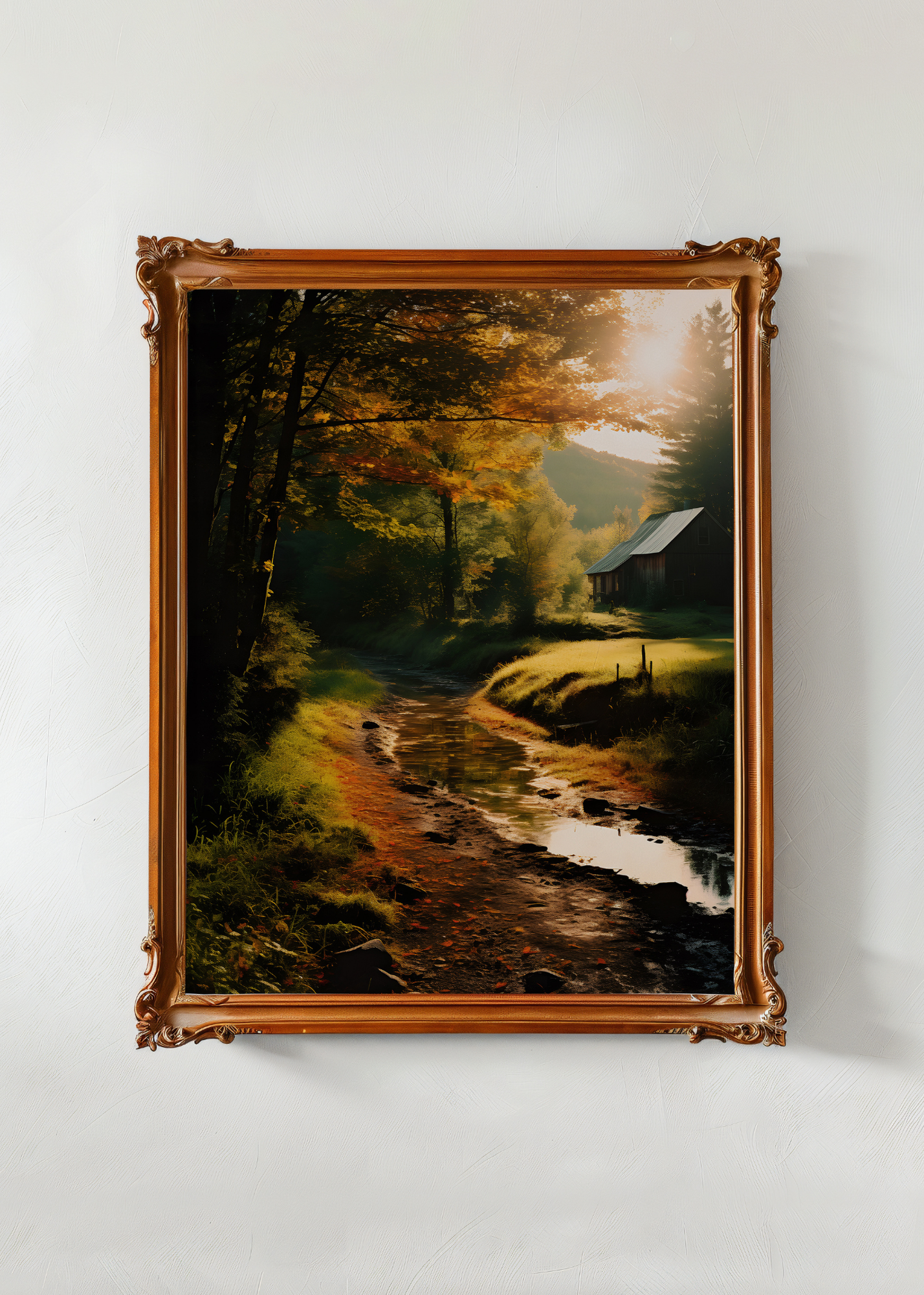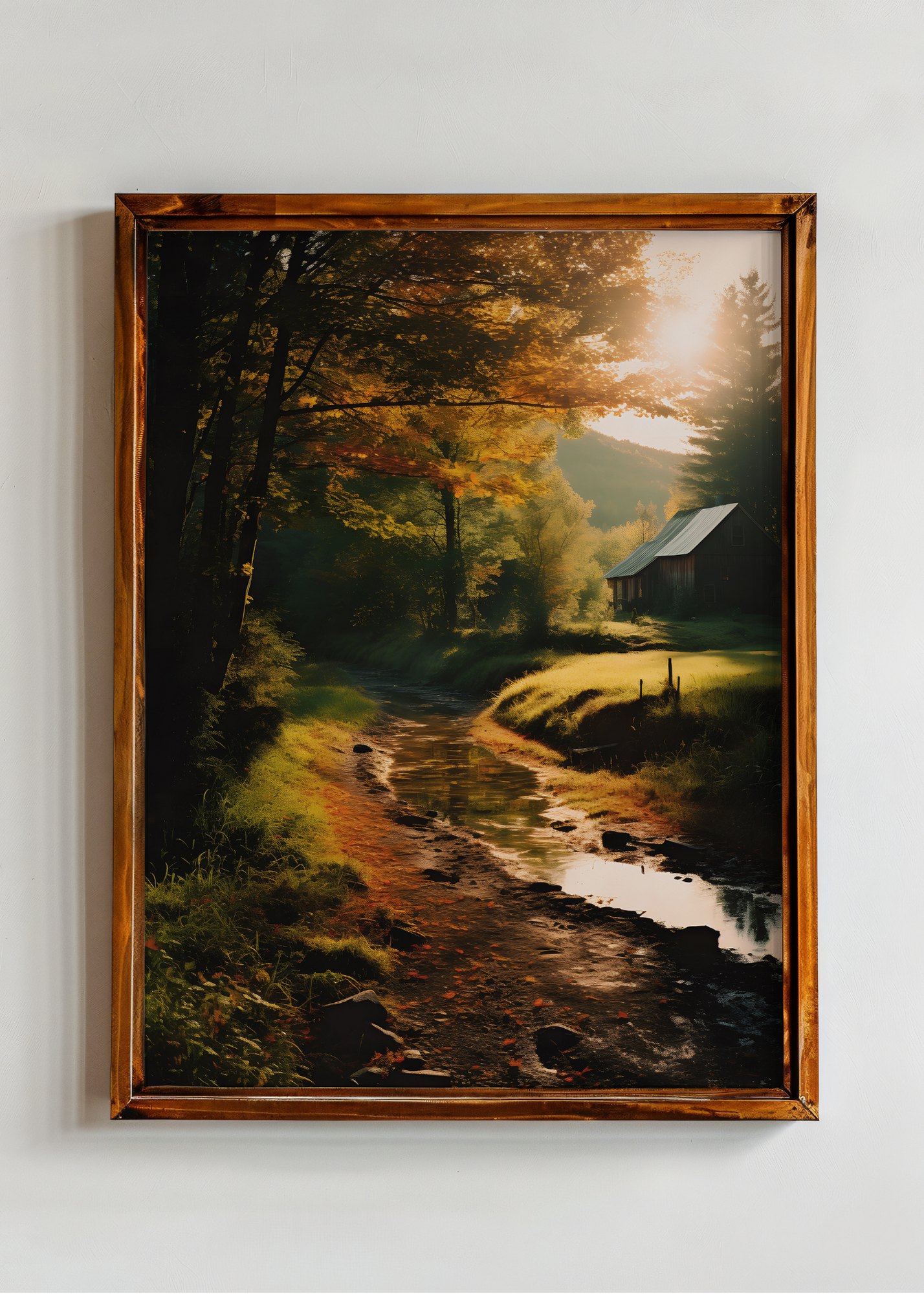 Creekside Solice— Bathed in golden morning light, this forest path bends gently around a shimmering stream, guiding you toward a tucked-away cabin at the edge of a dream. The trees, ablaze in amber and rust, cast long shadows and dappled light, like nature’s hush falling over the land. There’s a hush to this place, a reverence. This print feels like a slow exhale, a reminder that peace often lives off the beaten path.