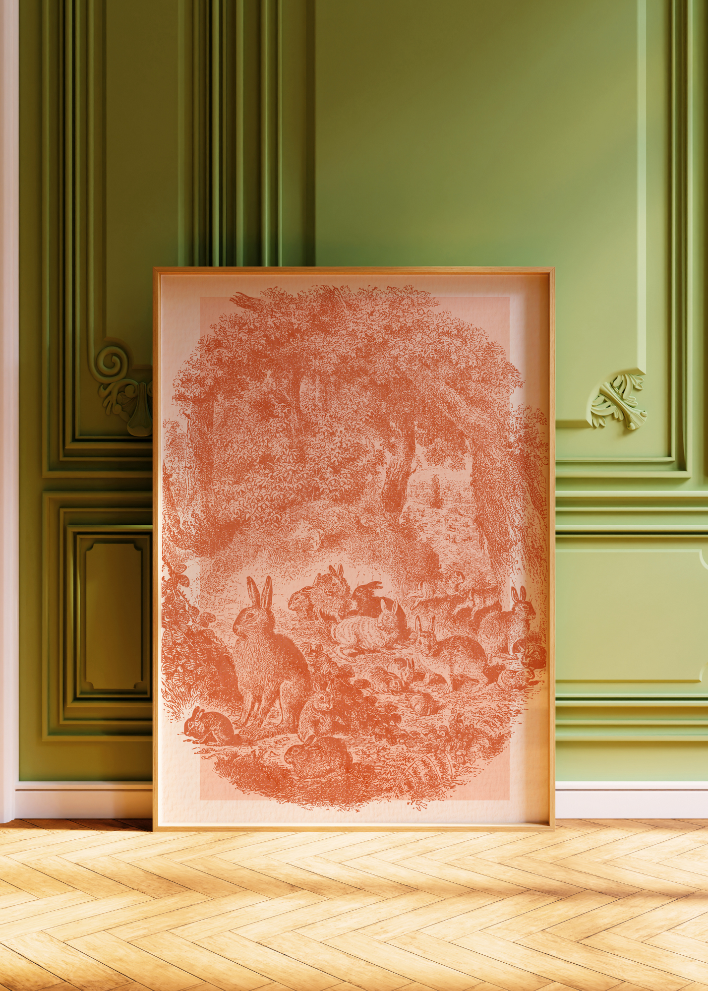 Softly in the Thicket— Tucked into a dreamy blush-pink woodland scene, a group of cozy little bunnies laze beneath branches and brush. The entire vintage-style print is washed in a soft, muted pink, giving it that timeless, storybook charm. It’s gentle, nostalgic, and made for slow mornings and warm-hearted corners.