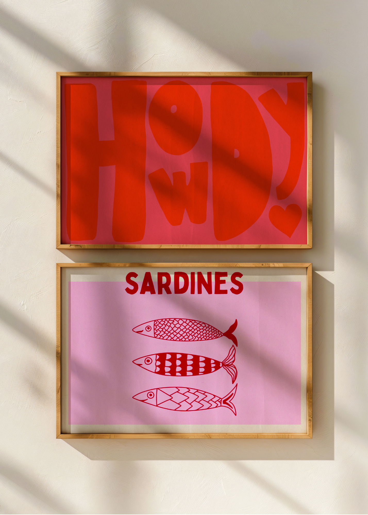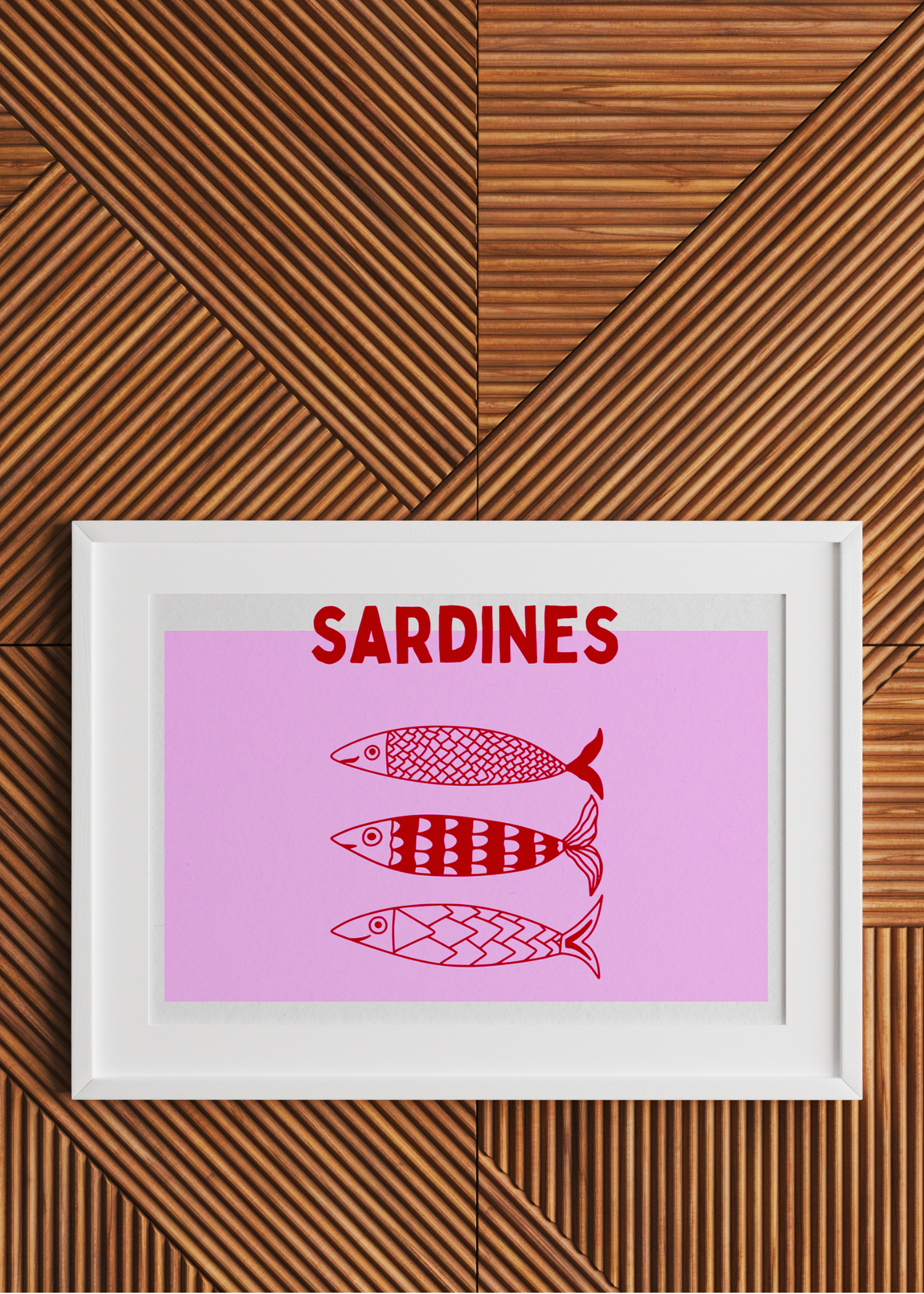 Pink Sardines— With a punch of playful nostalgia, on a pink background with dark pink accents, this print feature three fun fish illustrations stacked vertically beneath the word "Sardines" in bold block letters. Whimsical and slightly weird in all the right ways.