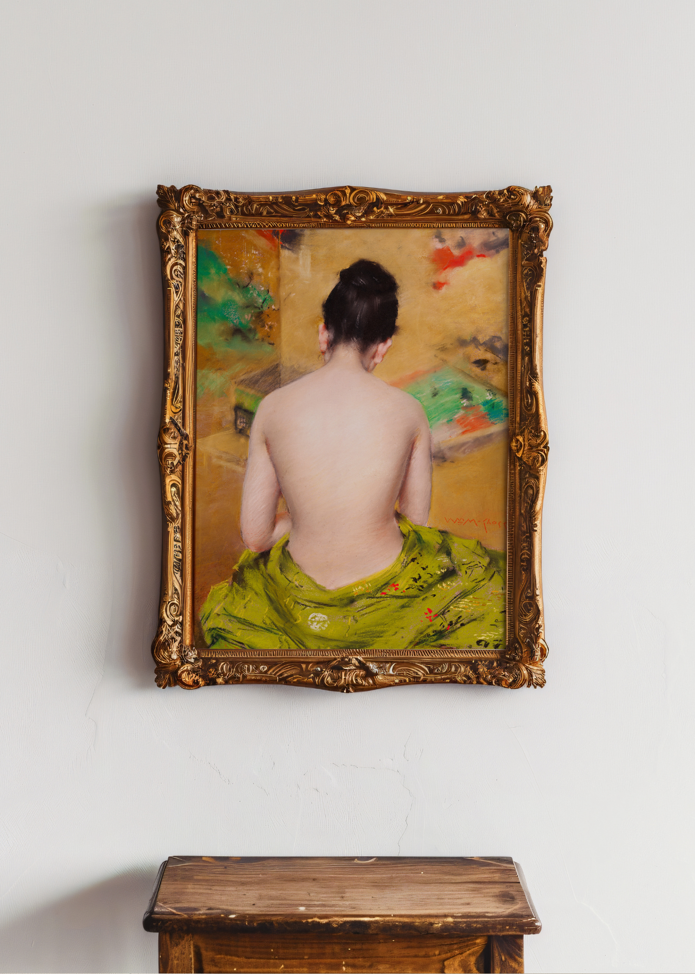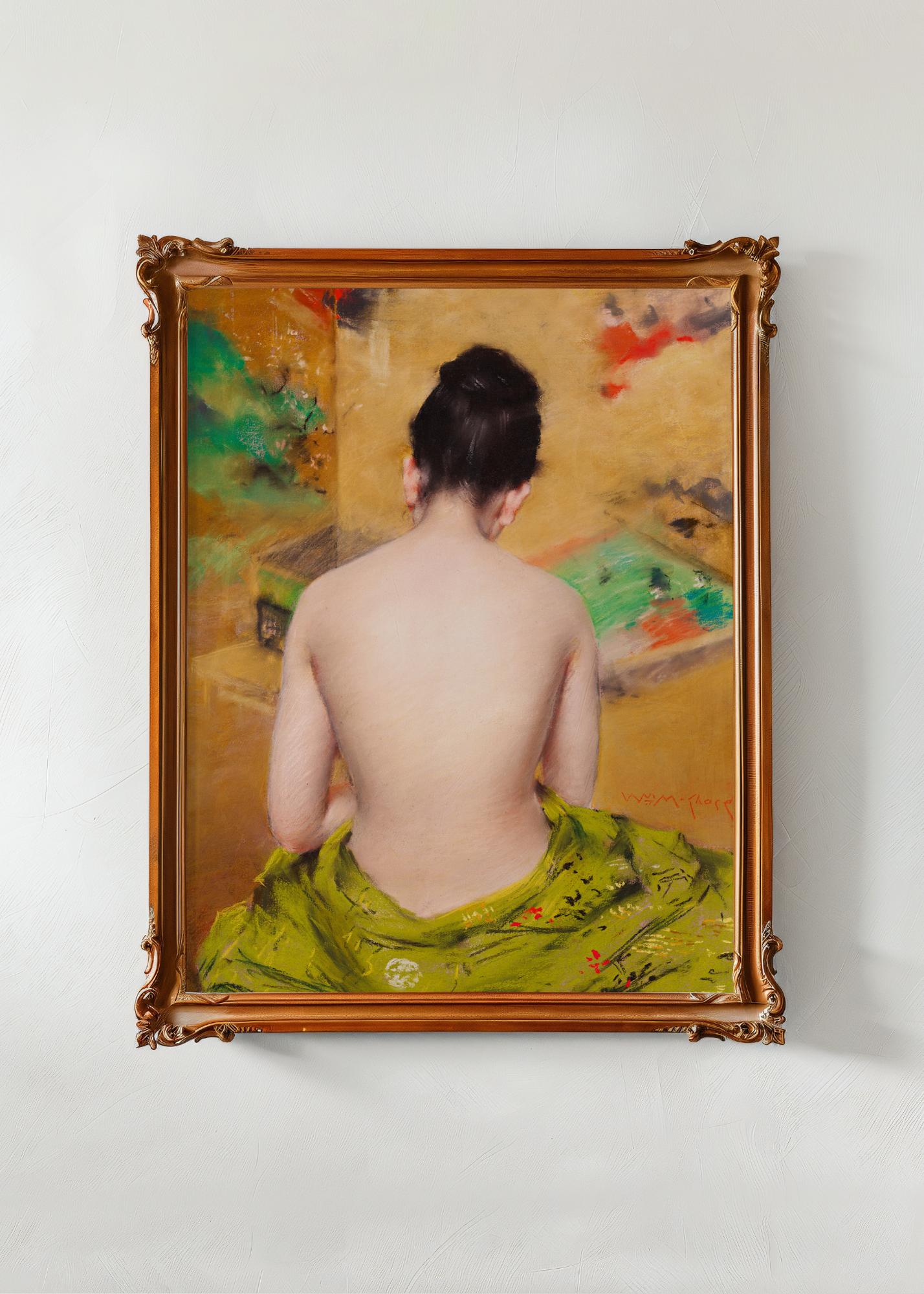 Study of Flesh Color and Gold— Bathed in warm light, Study of Flesh Color and Gold by William Merritt Chase is a quiet reverie in brushstrokes—a contemplative portrait of the female form turned away, lost in thought. Her back curves softly like a whisper, wrapped in tones of ivory, rose, and the faint shimmer of gold. The composition is intimate yet reserved, offering not a story, but a sensation—of light, of skin, of stillness. A tender meditation on beauty, shadow, and grace.