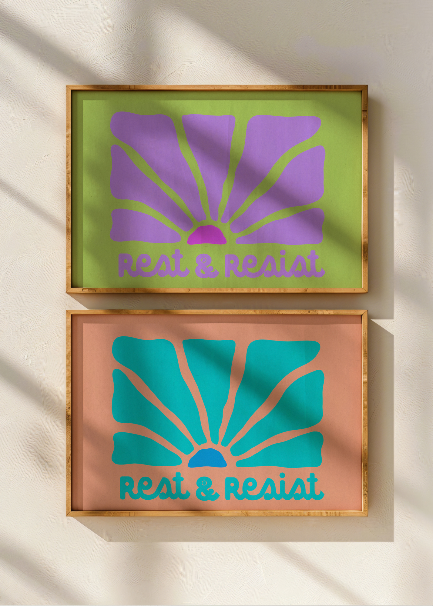 Rest Resist— A bold, modern series featuring colorful, bubbly sunset-like illustrations and the empowering phrase "rest & resist" in playful fonts. From green and purple to teal, blue, and soft pink colorways, each variation carries the same message: rest is radical, and resistance is beautiful. Perfect for quiet revolutionaries.