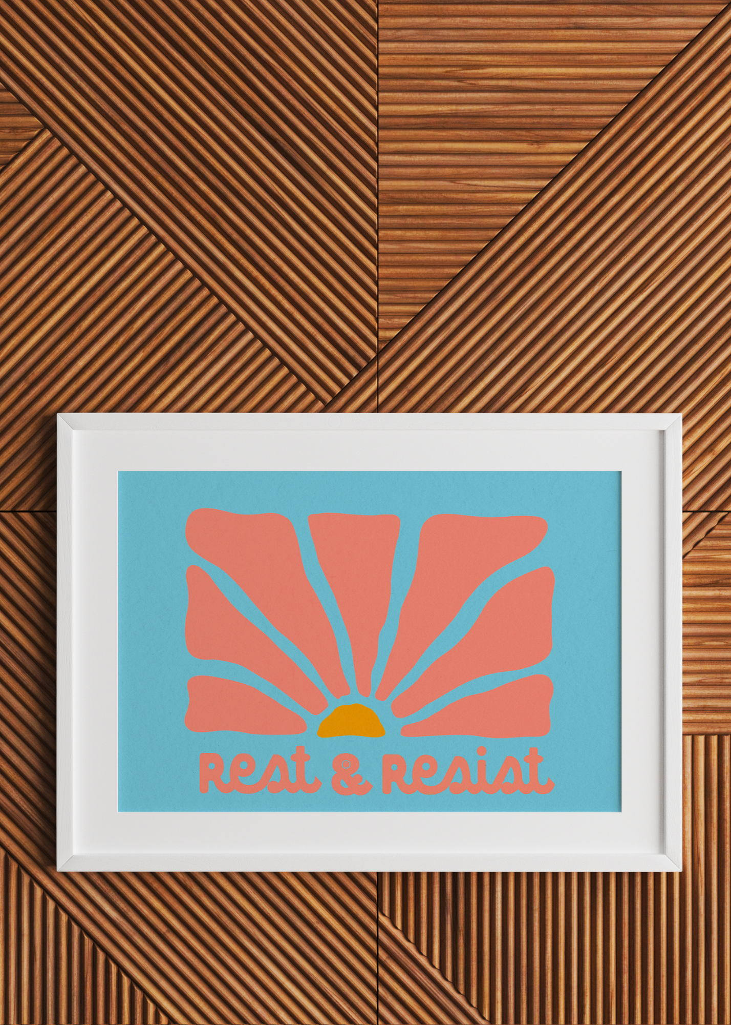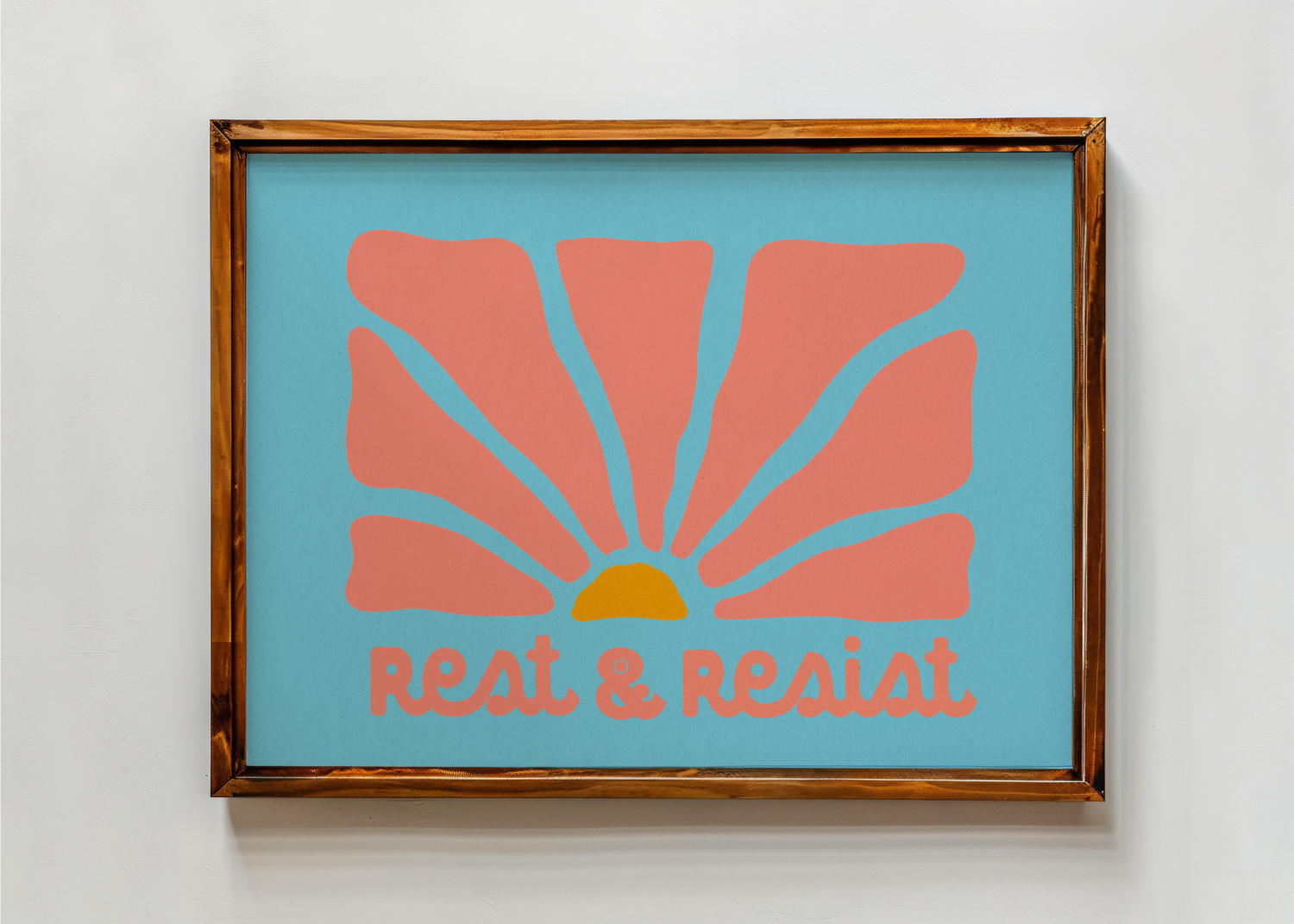 Rest Resist— A bold, modern series featuring colorful, bubbly sunset-like illustrations and the empowering phrase "rest & resist" in playful fonts. From green and purple to teal, blue, and soft pink colorways, each variation carries the same message: rest is radical, and resistance is beautiful. Perfect for quiet revolutionaries.