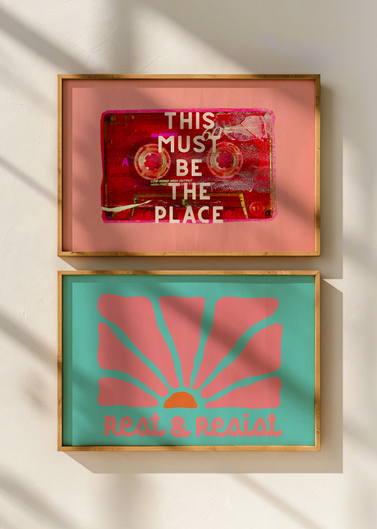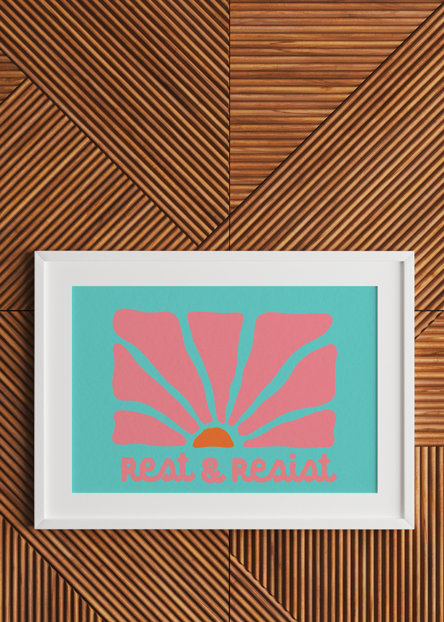 Rest Resist— A bold, modern series featuring colorful, bubbly sunset-like illustrations and the empowering phrase "rest & resist" in playful fonts. From green and purple to teal, blue, and soft pink colorways, each variation carries the same message: rest is radical, and resistance is beautiful. Perfect for quiet revolutionaries.