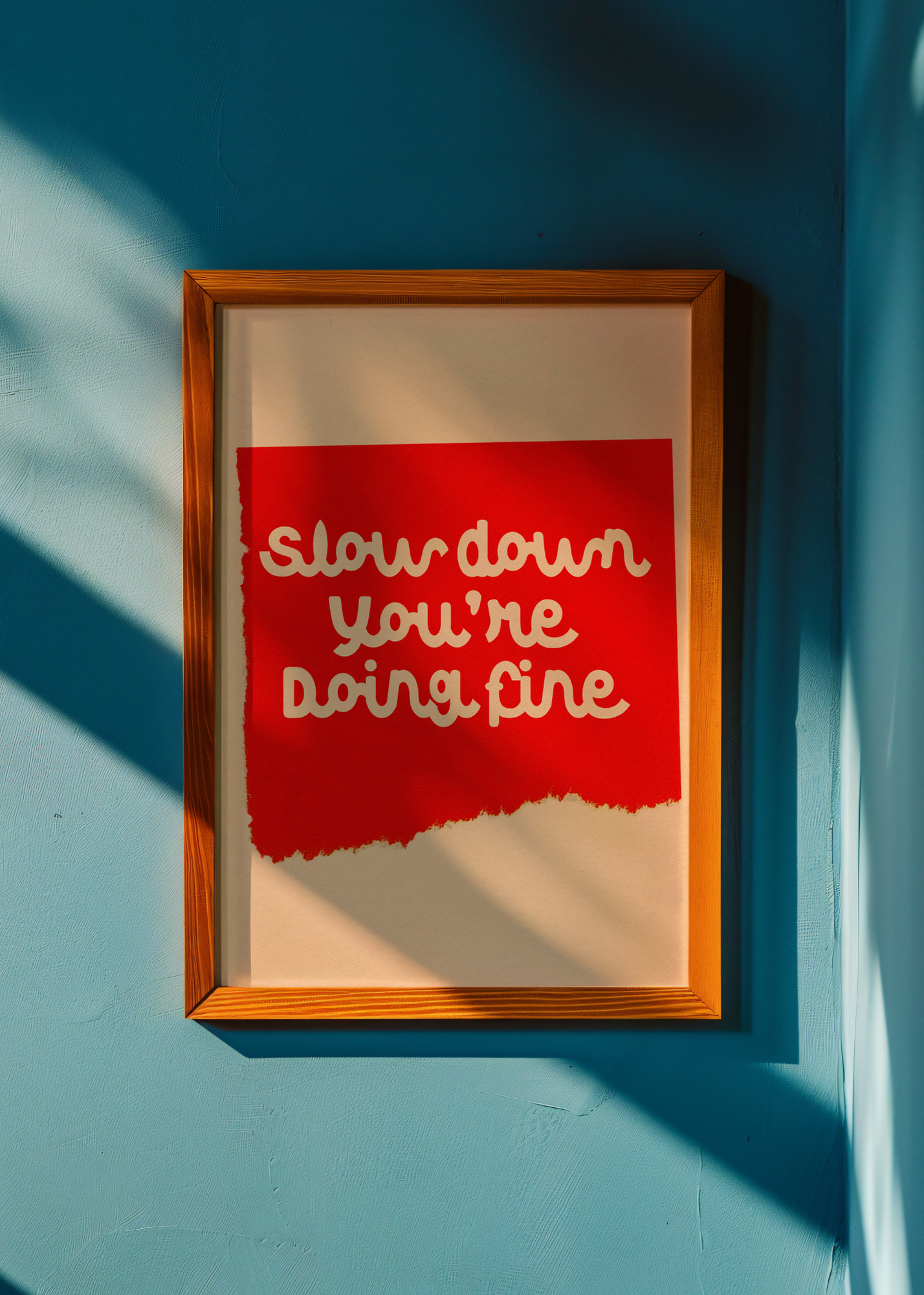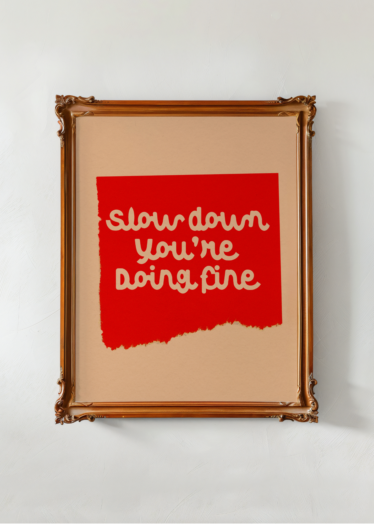Slow Down— A nod to Billy Joel's beloved song Vienna, this print features a tan background with a bright red ripped paper overlay. The comforting words "Slow down, you're doing fine" are written in a playful font, offering soft encouragement for busy hearts and tired minds.