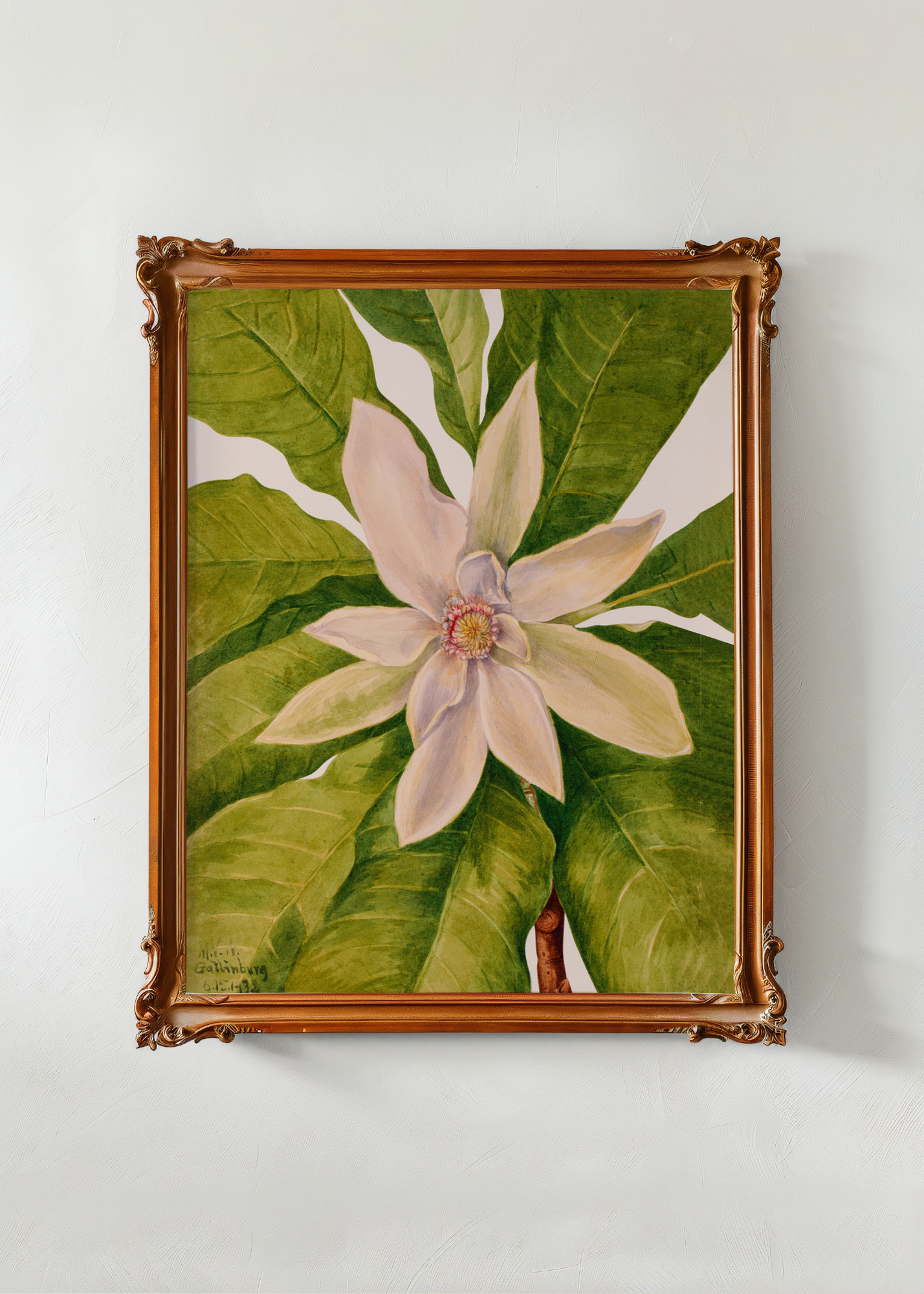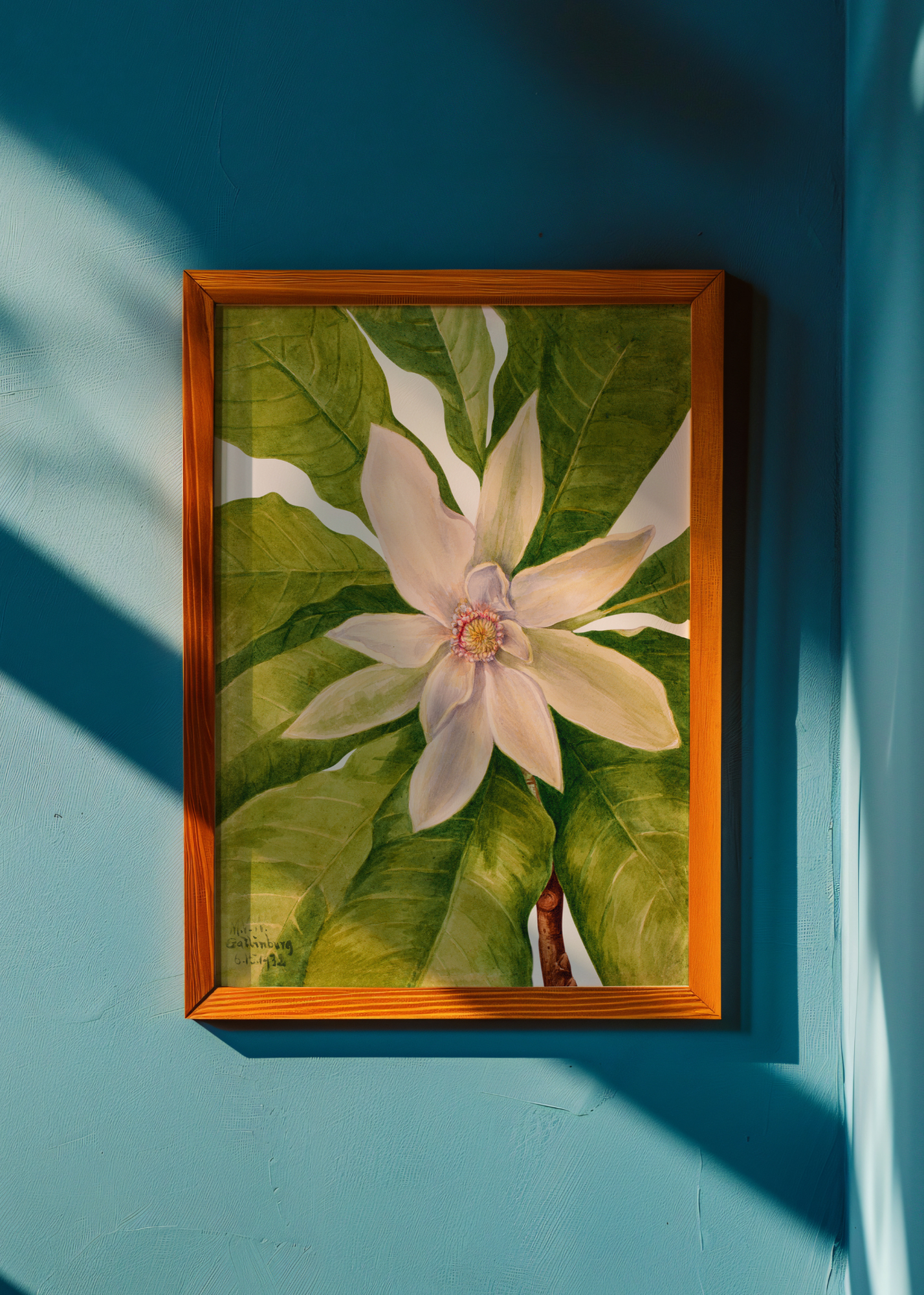 Umbrella Tree— Delicate yet commanding, Umbrella Tree unfolds in quiet grace under the hand of Mary Vaux Walcott. Painted with tender precision, its creamy petals stretch outward like pale stars against soft green—a fleeting moment of bloom captured in gentle stillness. There is reverence in every brushstroke, a deep admiration for nature’s quiet marvels. In this portrait of the Magnolia tripetala, Walcott offers not just a botanical study, but a hymn to ephemeral beauty—one that invites the viewer to pause, breathe, and see the sacred in the simple.