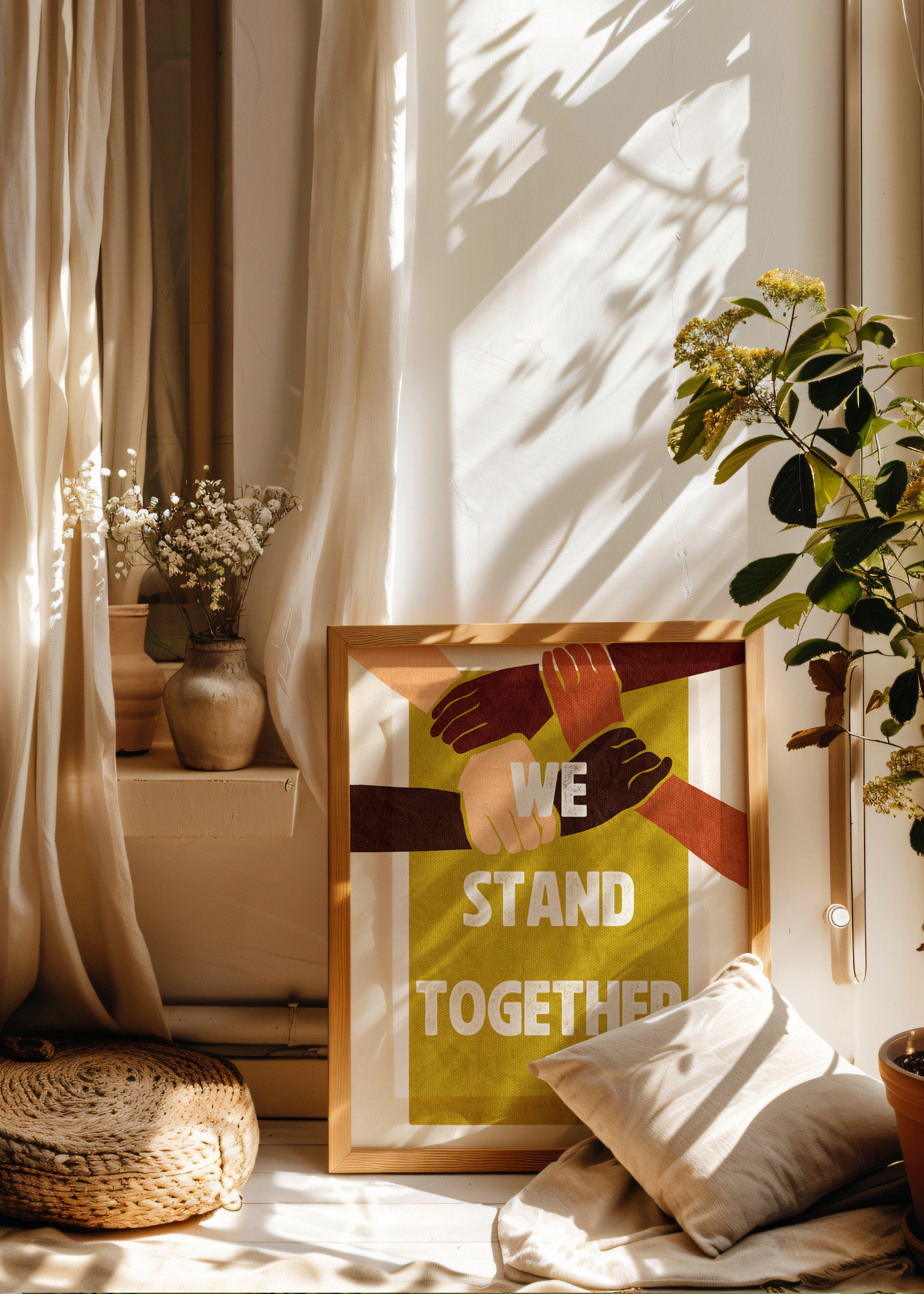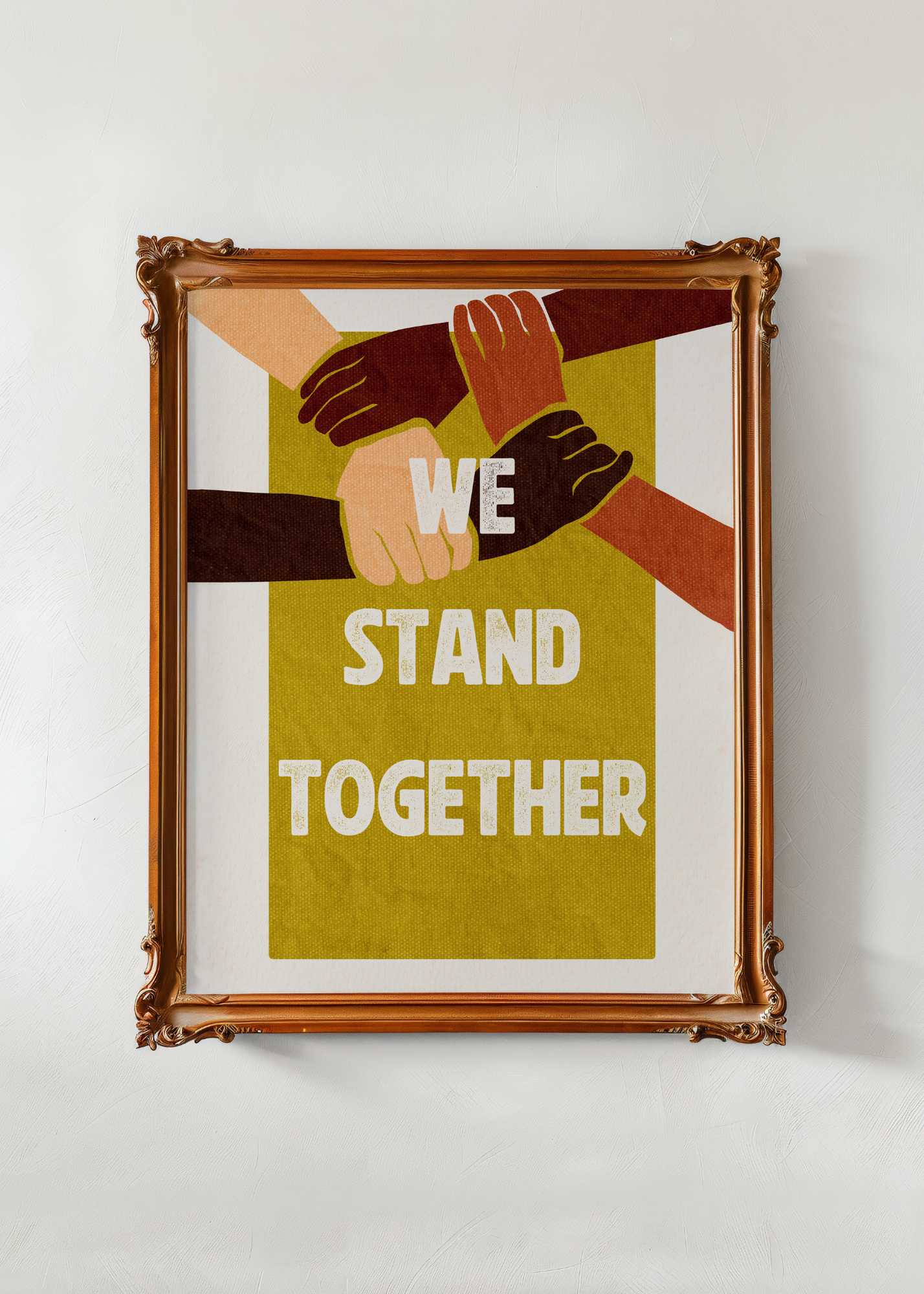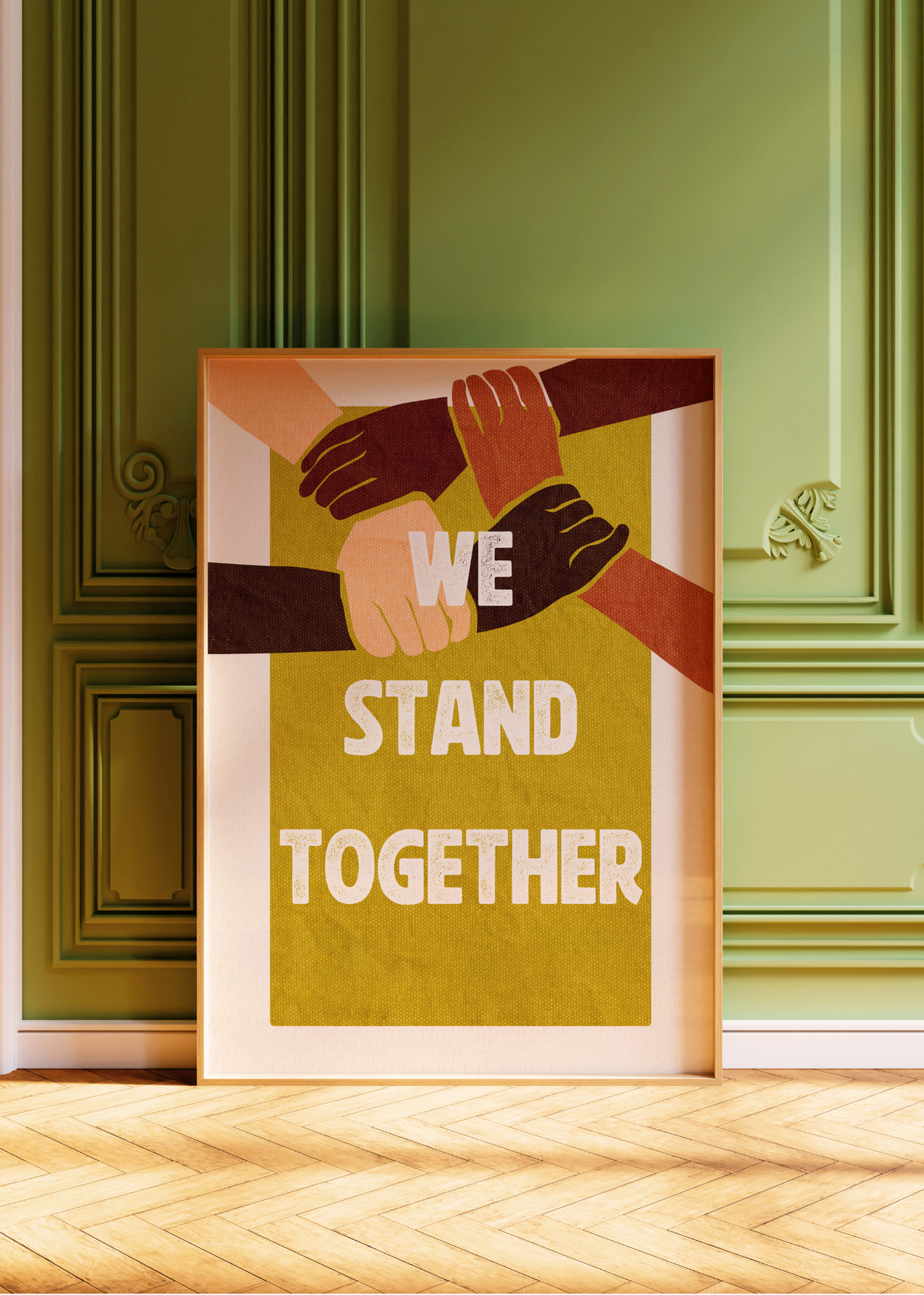 Stand Together— On a grounding green background, this powerful print features illustrated arms and hands linked together in unity and strength. With bold white lettering declaring "We stand together," it’s a tribute to solidarity, community, and collective care.