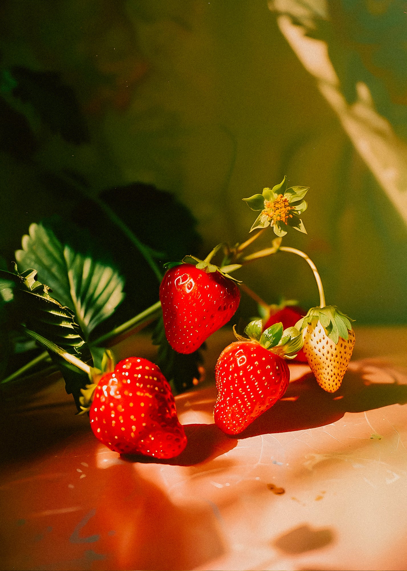 The sun is high and golden, warming the cobblestones beneath your feet as you wander through a lively summer market. The air is thick with laughter, music, and the sweet perfume of sun-ripened fruit. Somewhere nearby, a vendor is piling baskets high with glistening strawberries—each one red and glossy, their scent bursting forth in juicy waves that make you pause and smile.