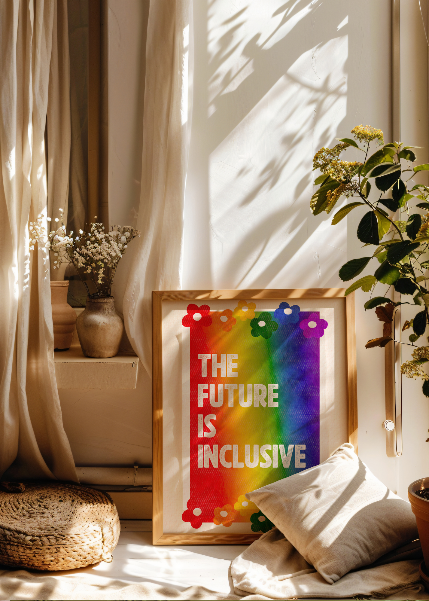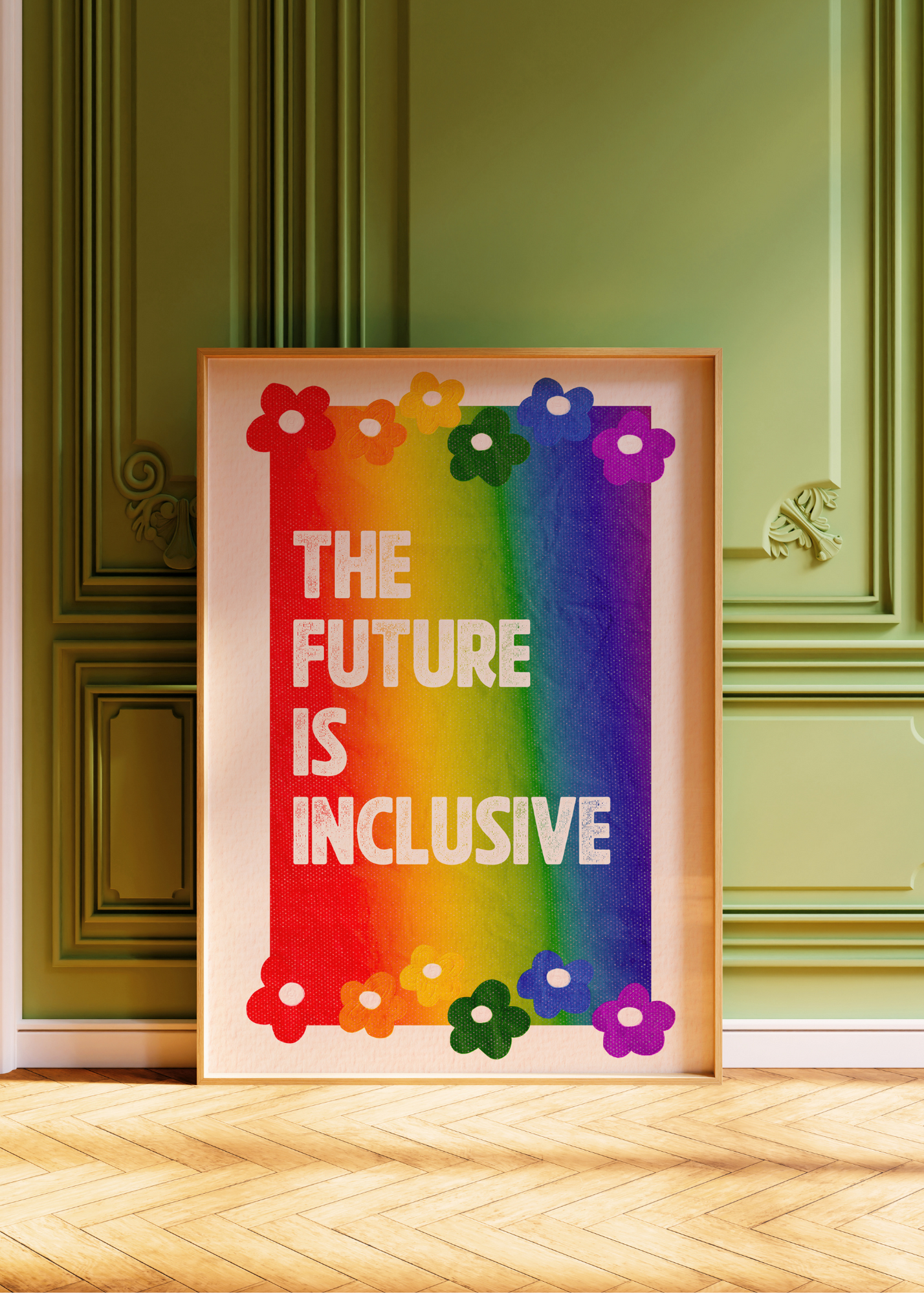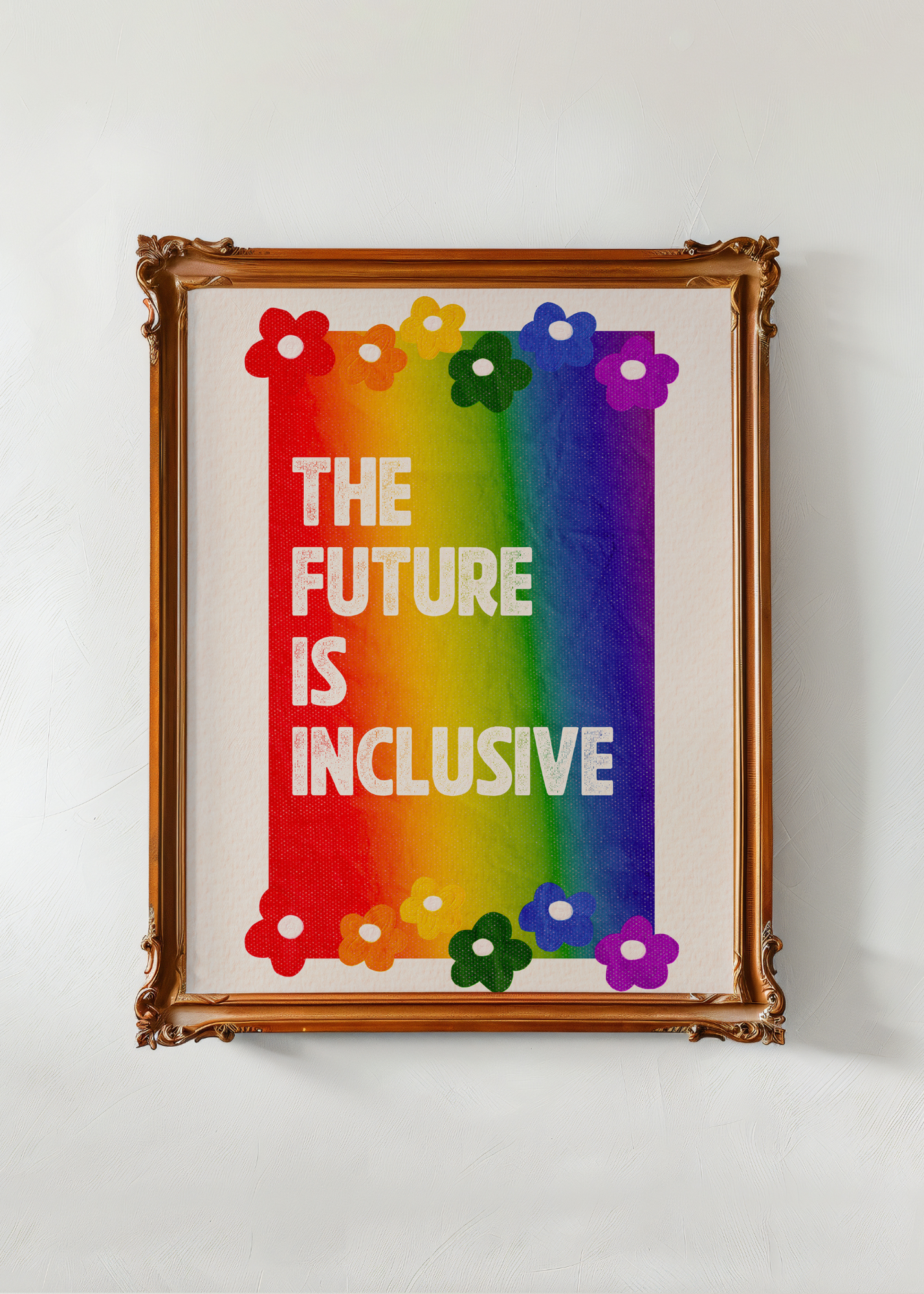 The Future is Inclusive— Radiant with diffuse rainbow colors and framed by flowers, this joyful print carries a powerful message: "The future is inclusive." Centered in white block letters, it’s a loving nod to the LGBTQIA+ community and a bright, hopeful call to build a better, more welcoming world for us all.