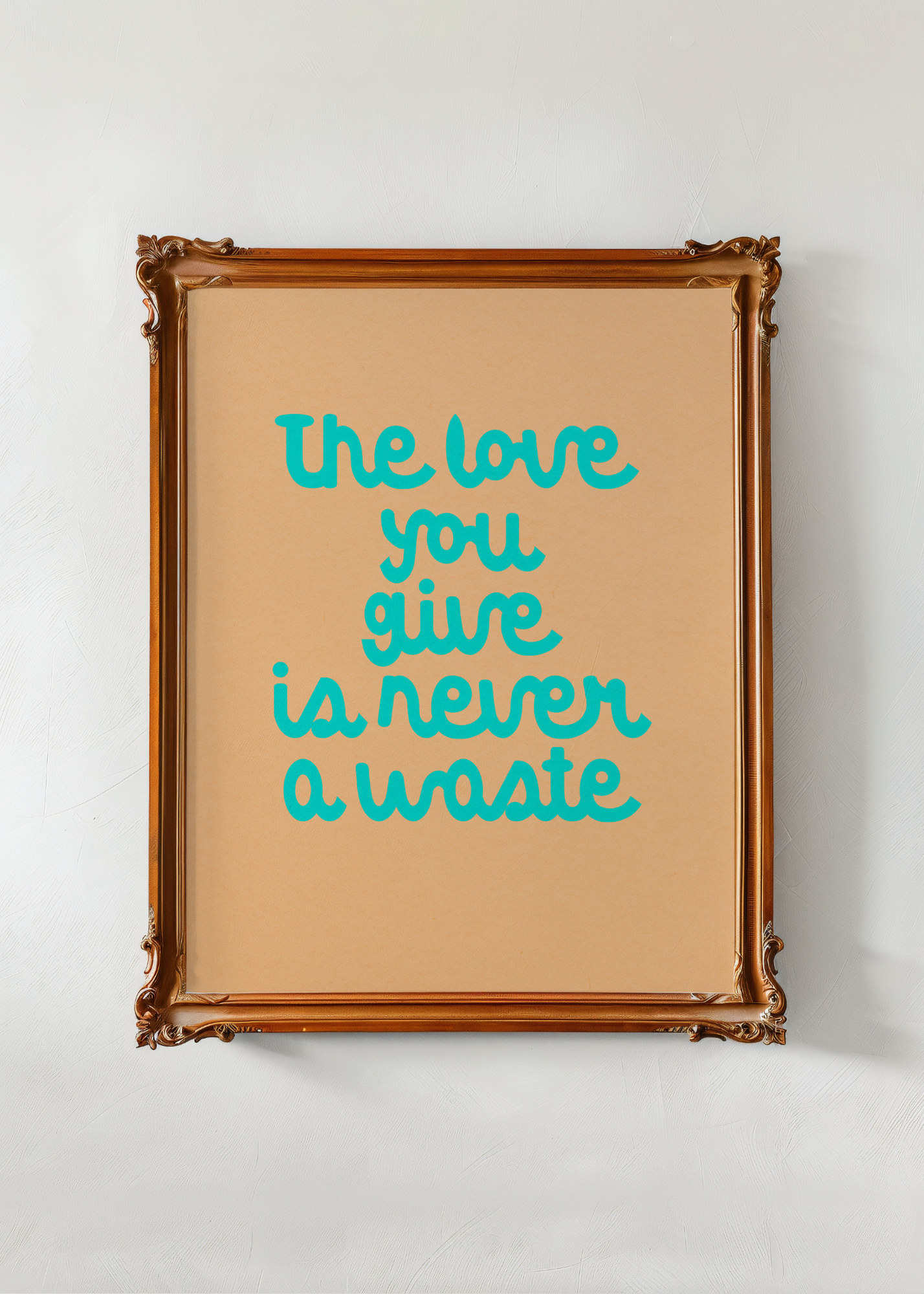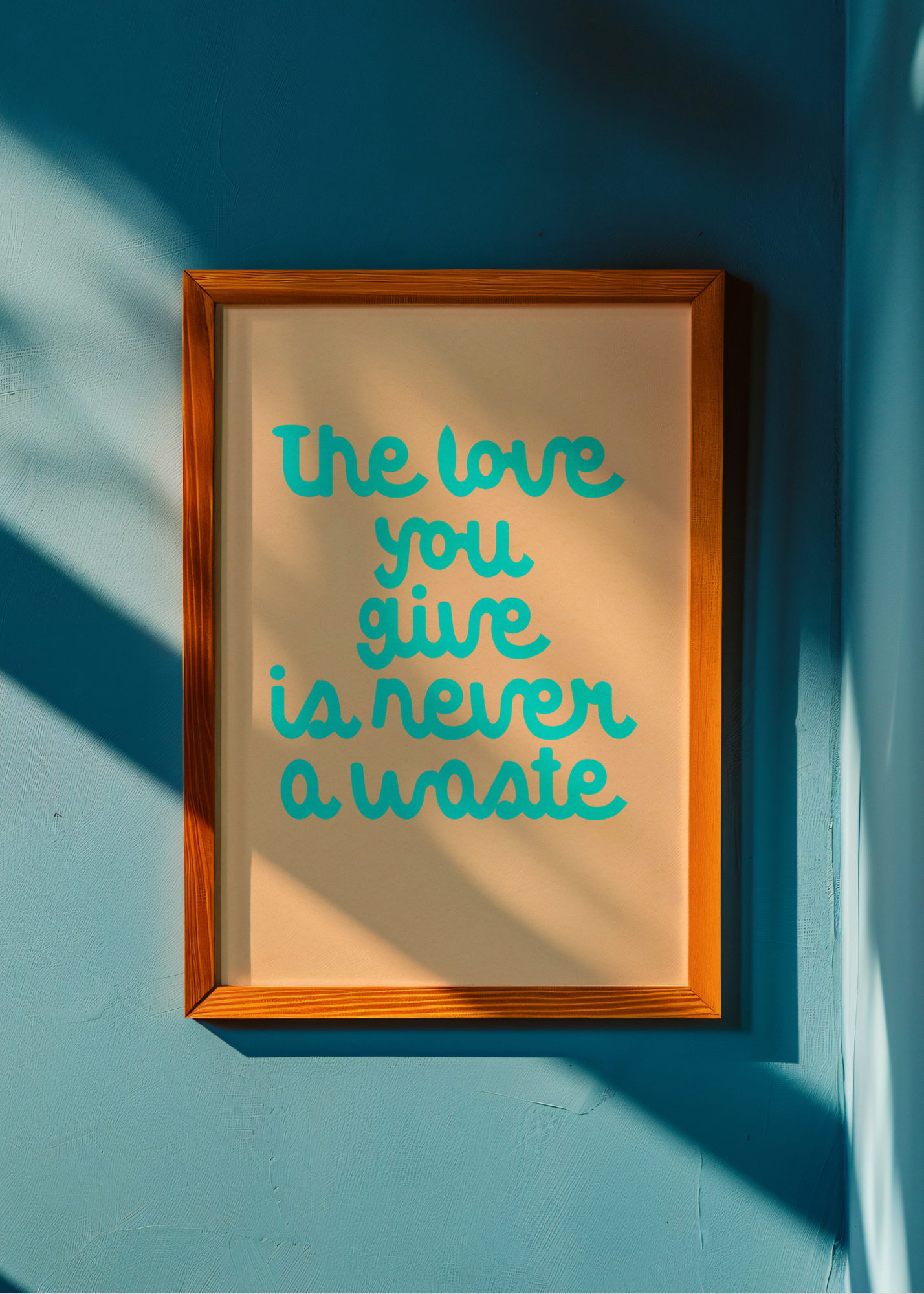 The Love You Give— Set against a soft orange background, this print delivers a gentle but powerful message in playful teal lettering. It’s a heart-hug of a reminder that every act of love matters, and kindness always echoes.