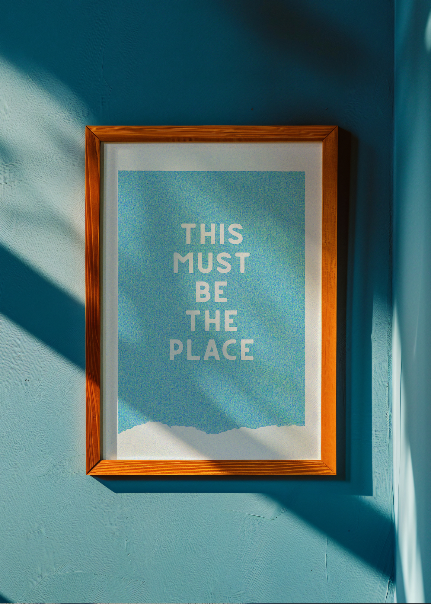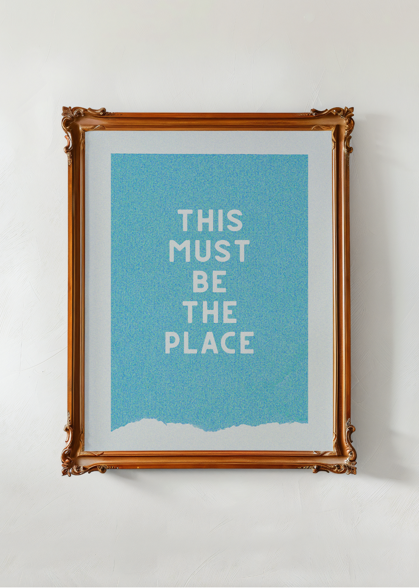 This Must Be the Place— A crisp white background frames a textured light blue paper scrap with a ripped bottom edge. In bold white lettering, the phrase "This must be the place" offers a cozy, grounded affirmation—like a note passed to your soul, reminding you that you belong.