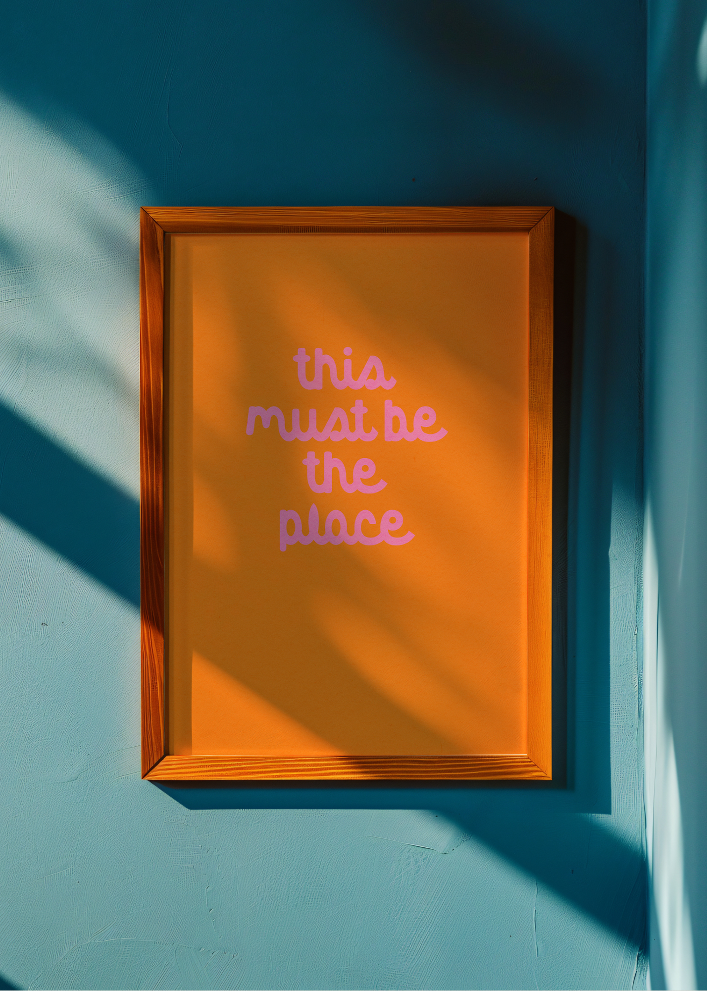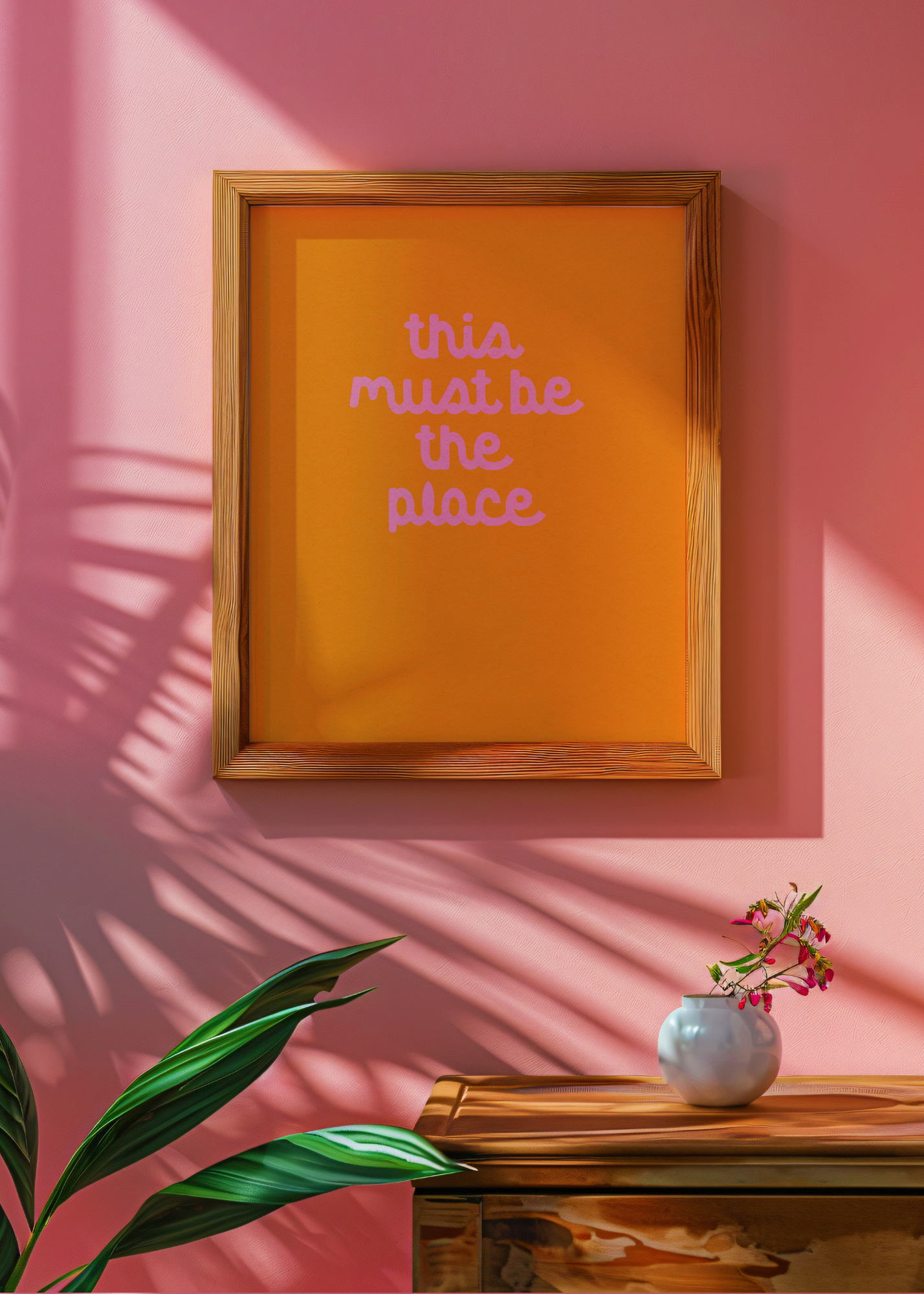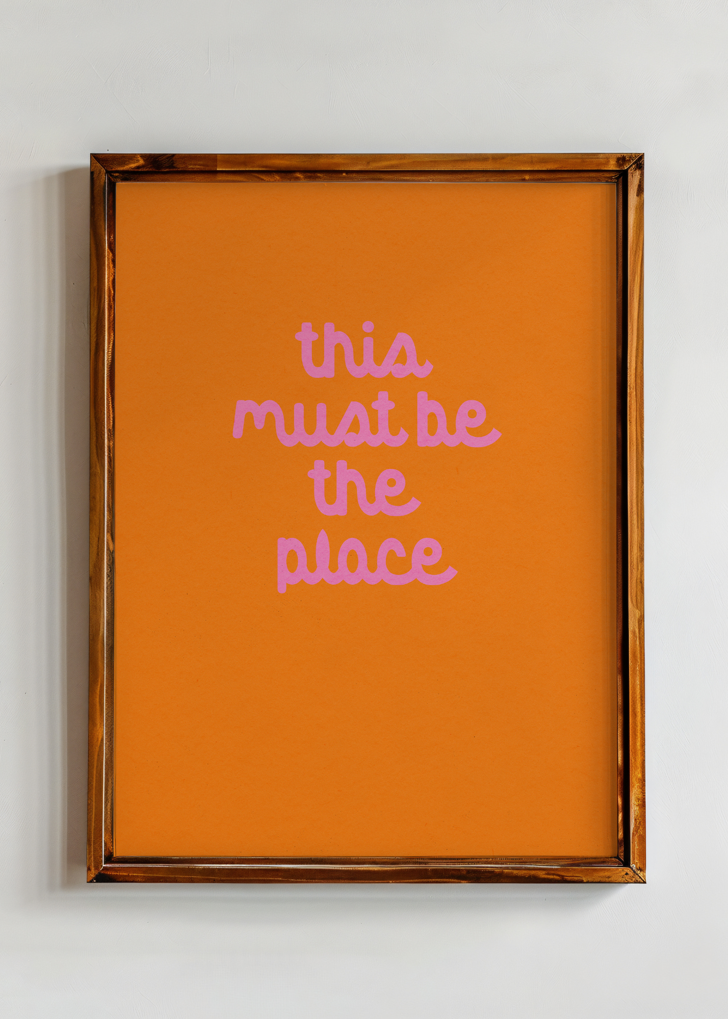 This Must Be the Place— With a playful font in bright pink over a vibrant orange background, this cheerful print radiates warmth and belonging. Simple yet full of charm, it’s a joyful reminder that sometimes, you’re already exactly where you need to be.