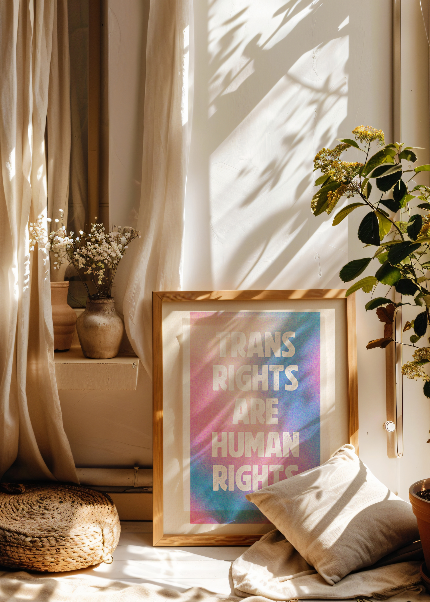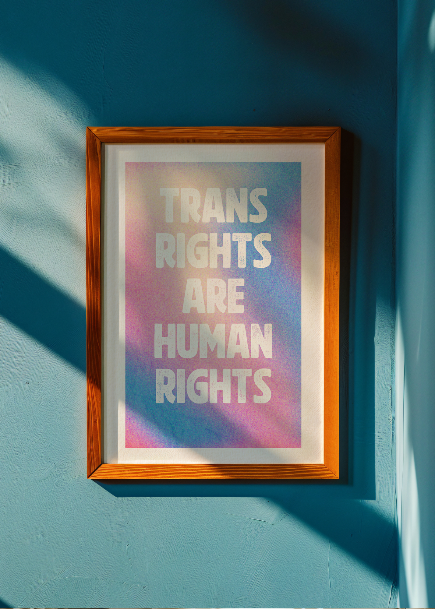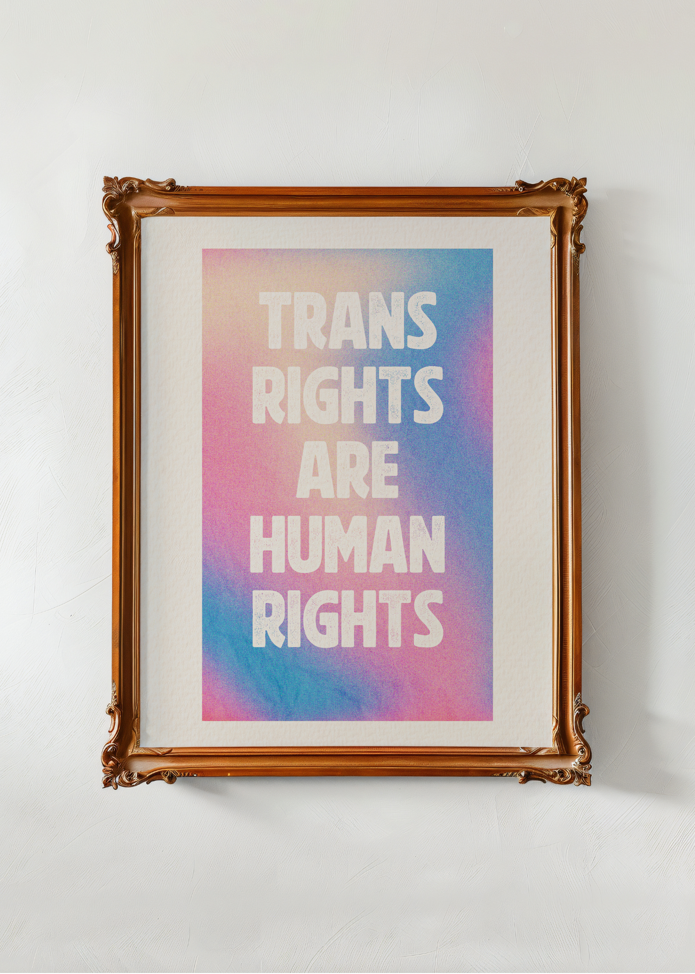 Trans Rights— Softly blended in hues of white, pink, and light blue, this print honors the colors of the trans flag and radiates warmth and love. In clean, bold white block lettering, the message is simple but powerful: "Trans rights are human rights." A gentle, affirming reminder that every person deserves dignity, safety, and love, exactly as they are.