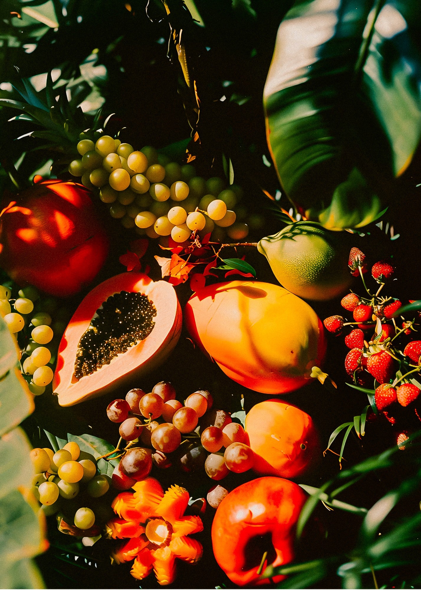 A step further and the world opens up—ripe black cherries dangle from low, leafy branches, their deep, tart perfume balancing the sweetness in the air. Beneath them, soft banana trees stretch toward the sky, their fruit mellow and creamy, bringing a golden richness to the morning hush. And just beyond, coconut palms sway above, releasing the soft, nutty scent of fresh coconut milk that drifts through the heat like a lullaby.