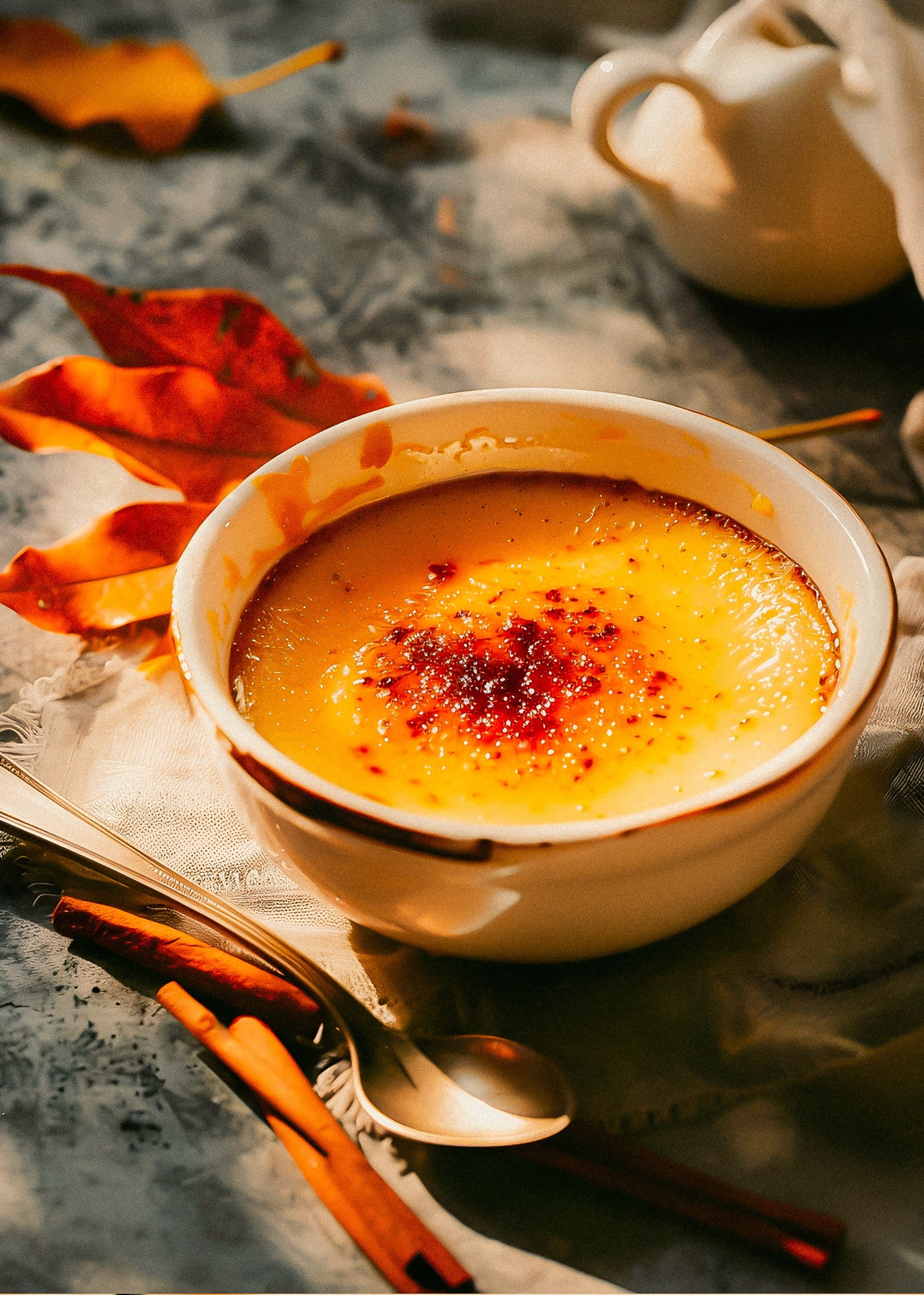 A porcelain dish is placed gently before you, its surface gleaming with a golden, crackled crust. You lean in, and the warm scent rises like a whisper: rich vanilla custard, silky and smooth, swirled with the dark sweetness of maple-kissed rum. The top layer has been toasted to perfection, its caramelized sugar still warm from the torch, offering the slightest resistance before giving way with a satisfying crack.