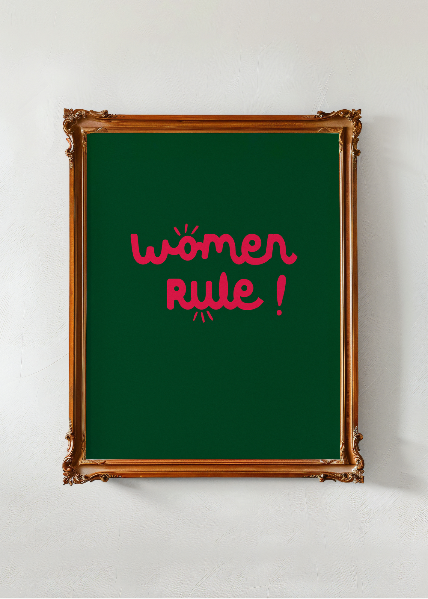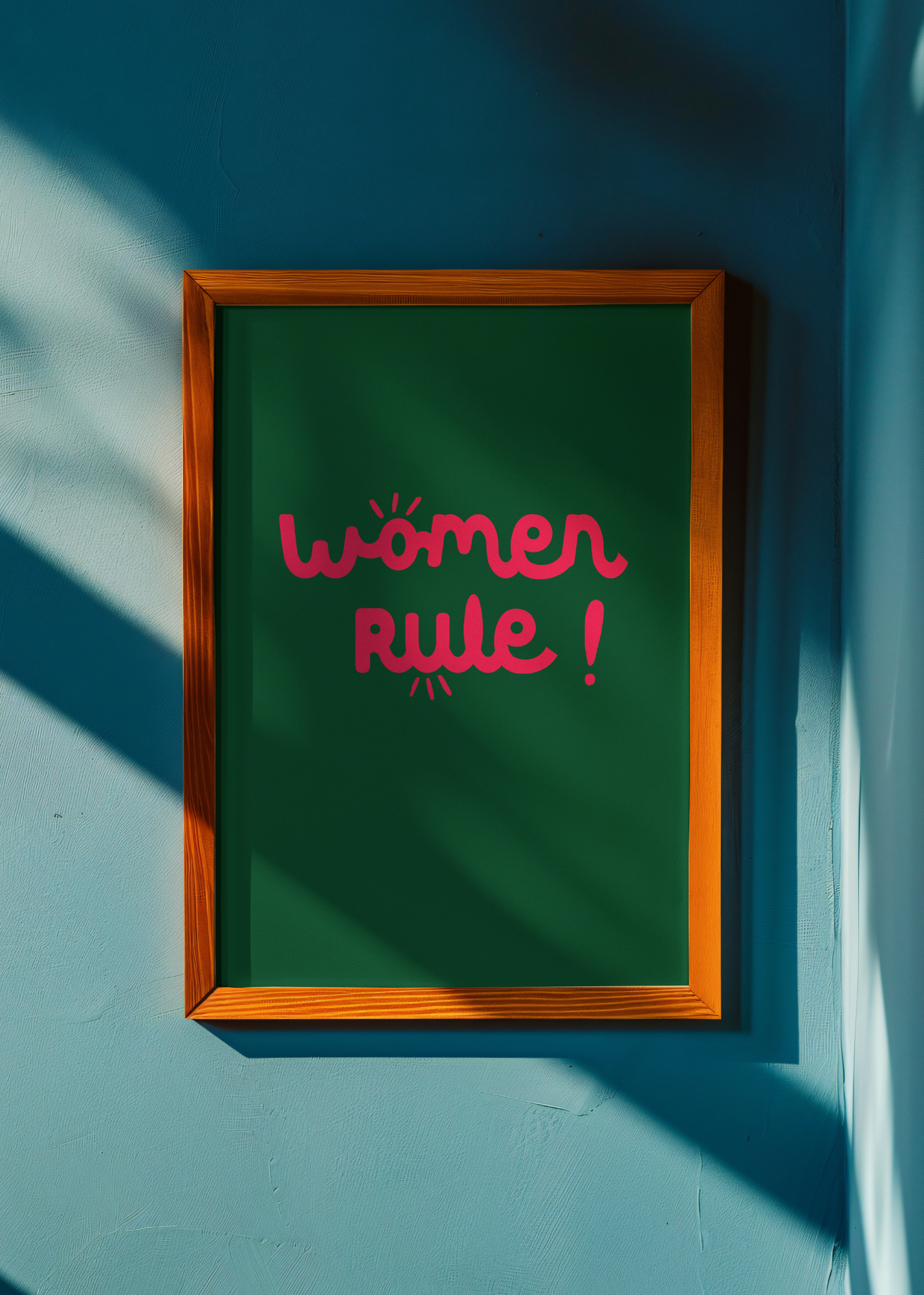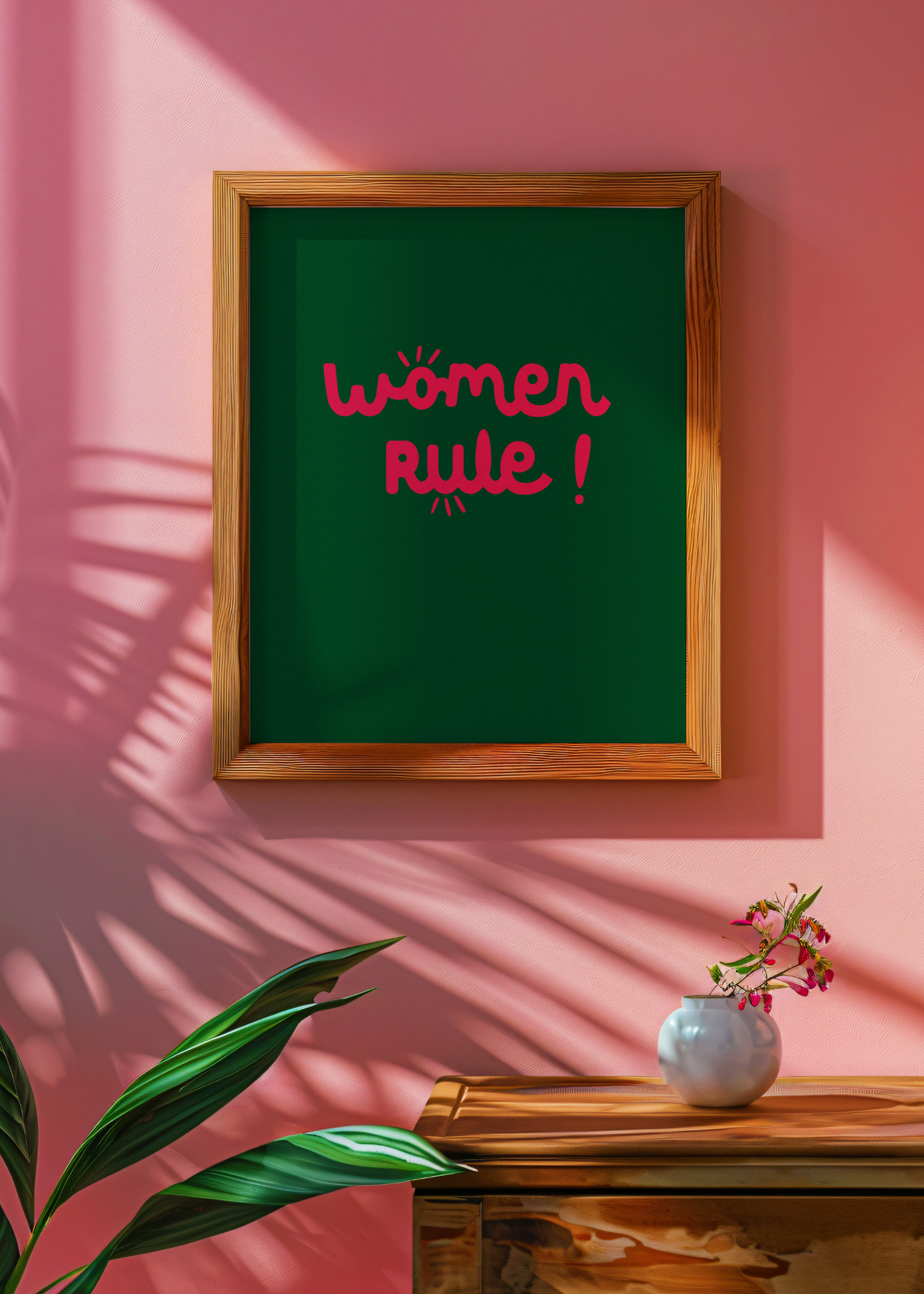 Women Rule— Set against a striking green background, this bold and beautiful print makes its message loud and clear: women rule! Bright pink lettering in a fun, playful font brings the energy, celebrating strength, resilience, spirit, and sisterhood. It’s a vibrant declaration of feminine power — perfect for anyone who believes in lifting women up and owning their space with pride and vibrant joy— because women absolutely do rule!