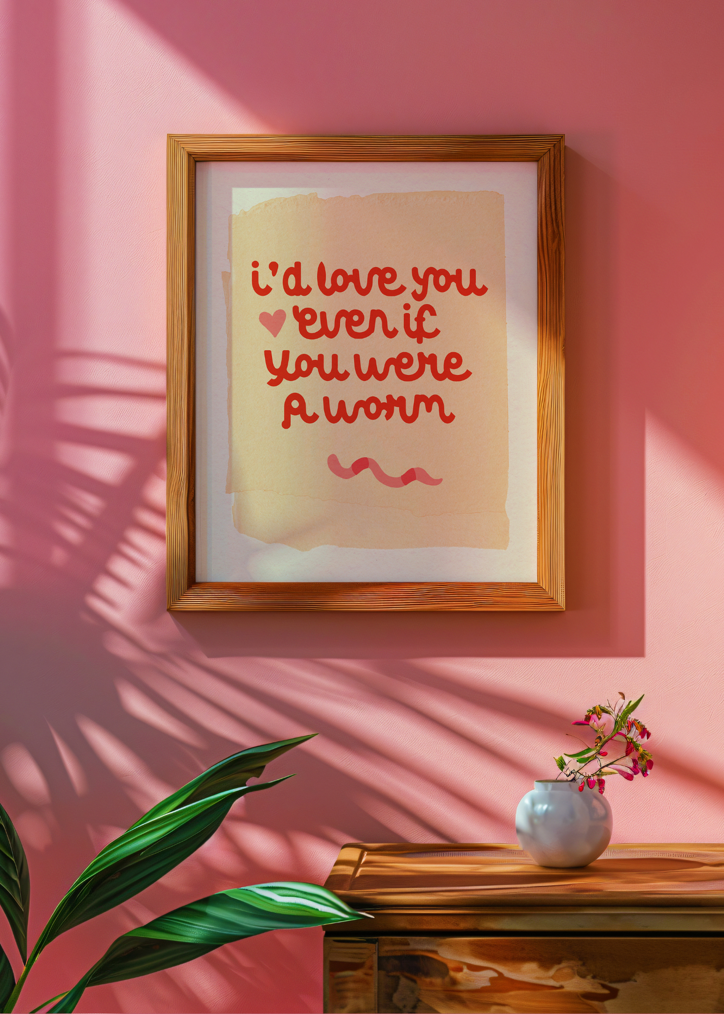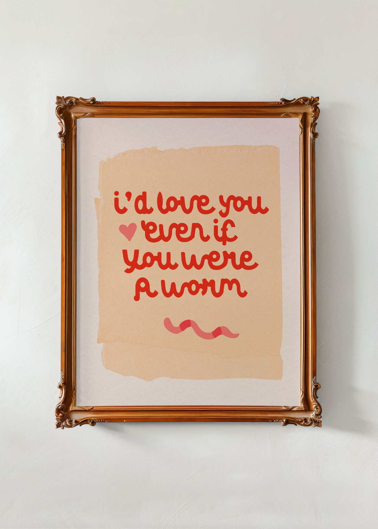 Worm— Set against the textured look of a torn tan paper background, this print keeps it lighthearted and full of love. In bright, playful red lettering, the phrase “I’d love you even if you were a worm” stretches across the page — a quirky, endearing declaration of unconditional affection. It’s the perfect little reminder that real love is weird and wonderful.