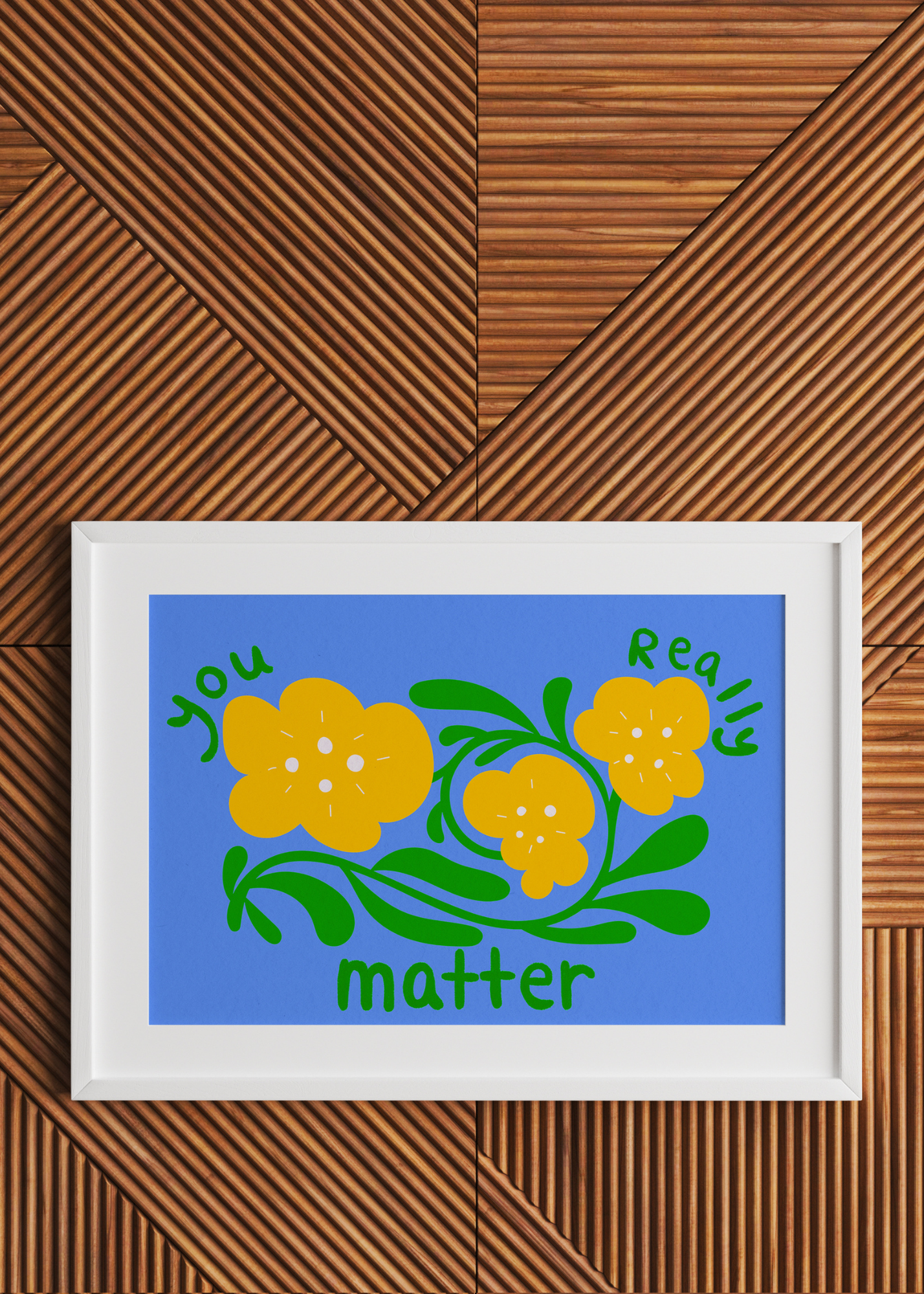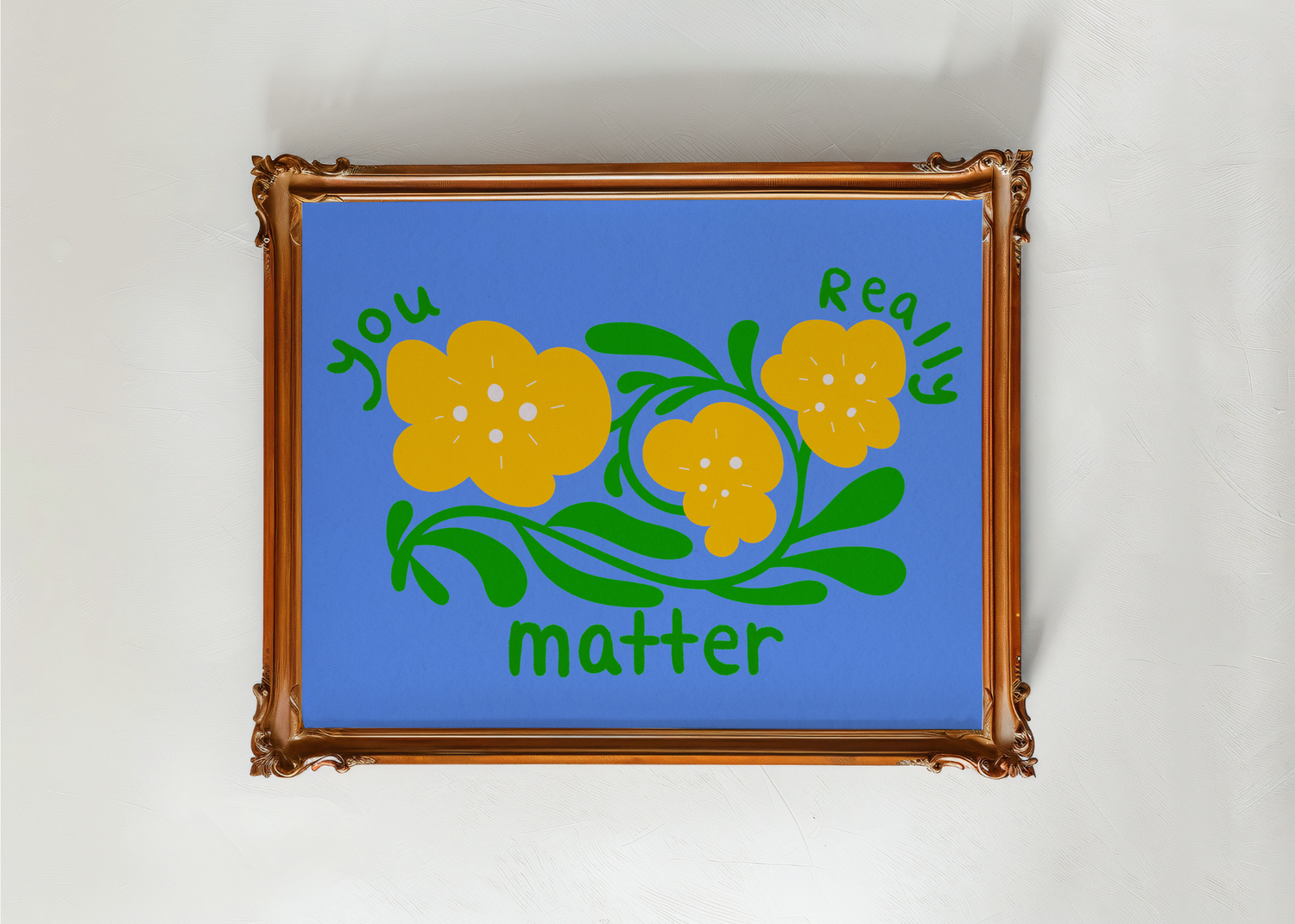 You Really Matter— Set against a vibrant blue background, bold yellow flowers bloom from delicate green stems. Floating above them, hand-drawn bubble letters whisper a quiet truth: you really matter. This piece radiates kindness with a gentle reminder that your presence is needed, your voice is heard, and your being is enough—just as you are.