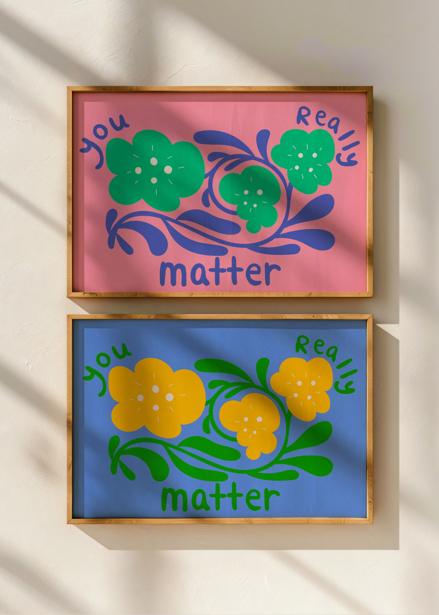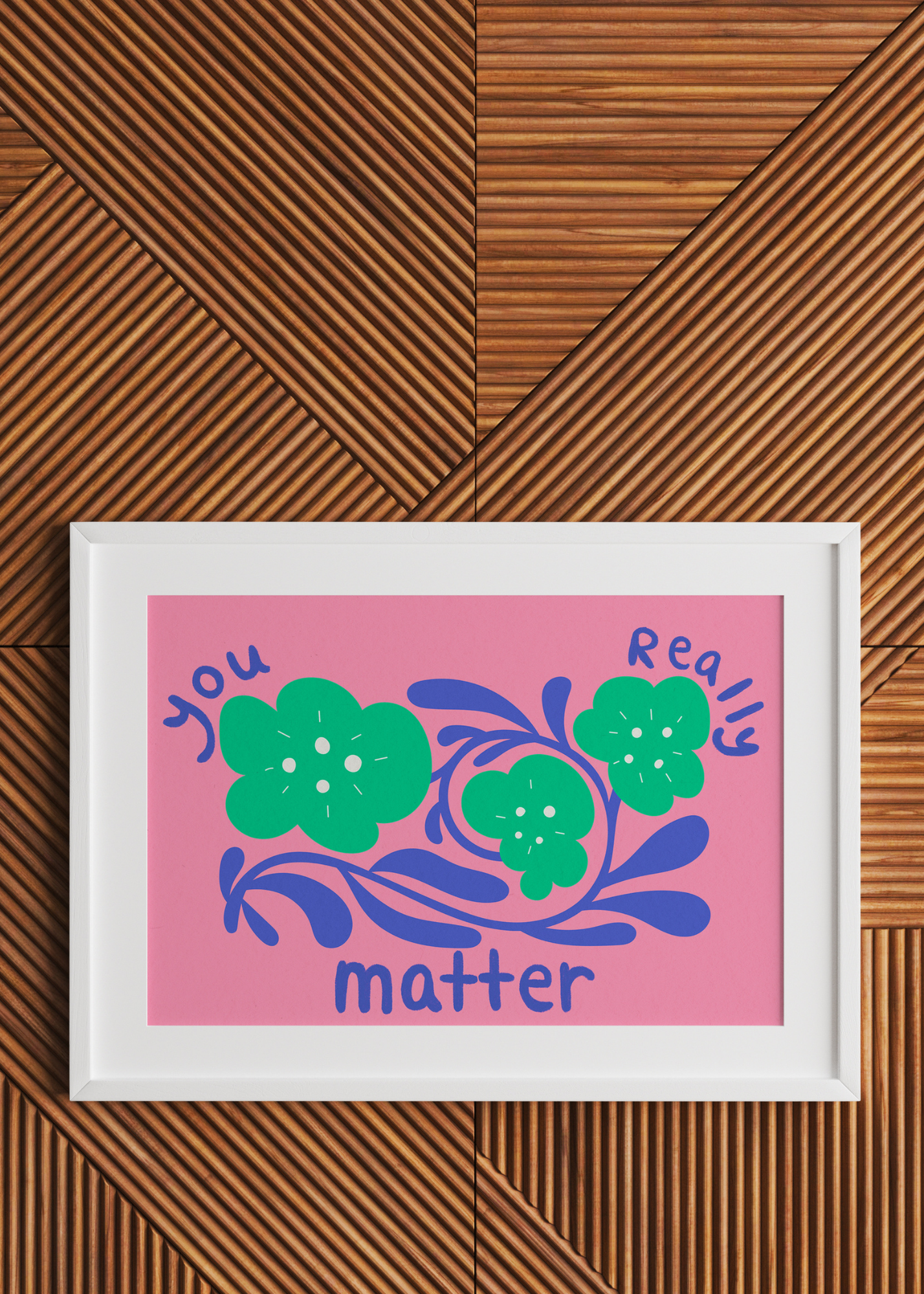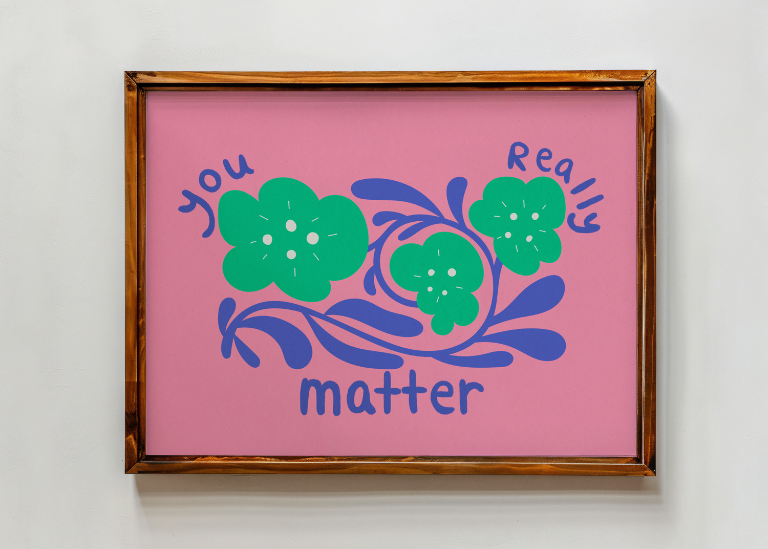 You Really Matter— Set against a vibrant pepto-pink background, bold teal flowers bloom from delicate blue stems. Floating above them, hand-drawn bubble letters whisper a quiet truth: you really matter. This piece radiates kindness with a gentle reminder that your presence is needed, your voice is heard, and your being is enough—just as you are.
