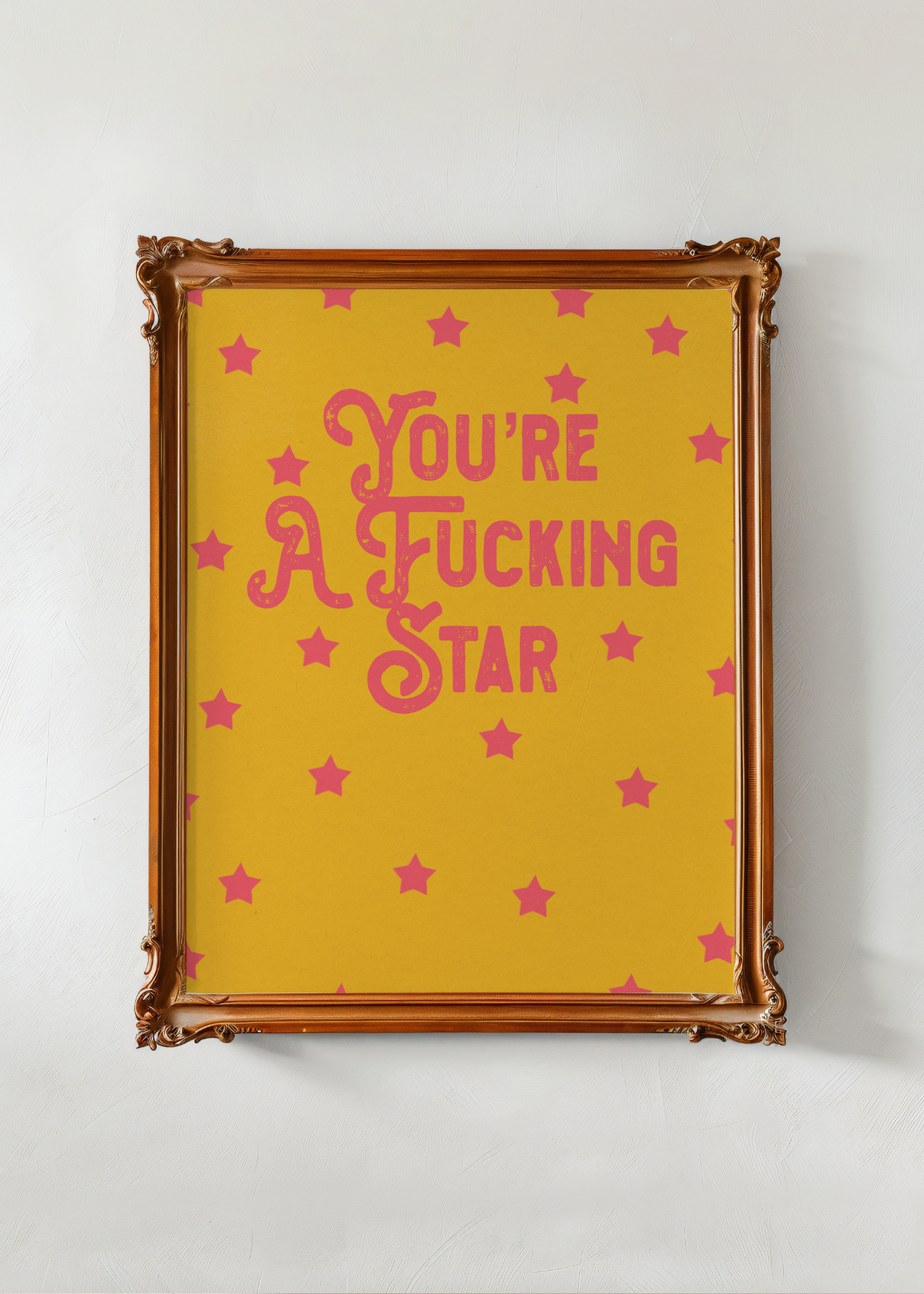 You're A Fucking Star— Bright and loud, this piece shines unapologetically. Against a golden yellow backdrop, pink stars scatter like confetti, each one echoing the joyful rebellion of its message: you’re a fucking star. Bold, playful, and full of heart, this print is a celebration of self-worth and sparkle—made to lift spirits, light up rooms, and remind you of your inner glow.
