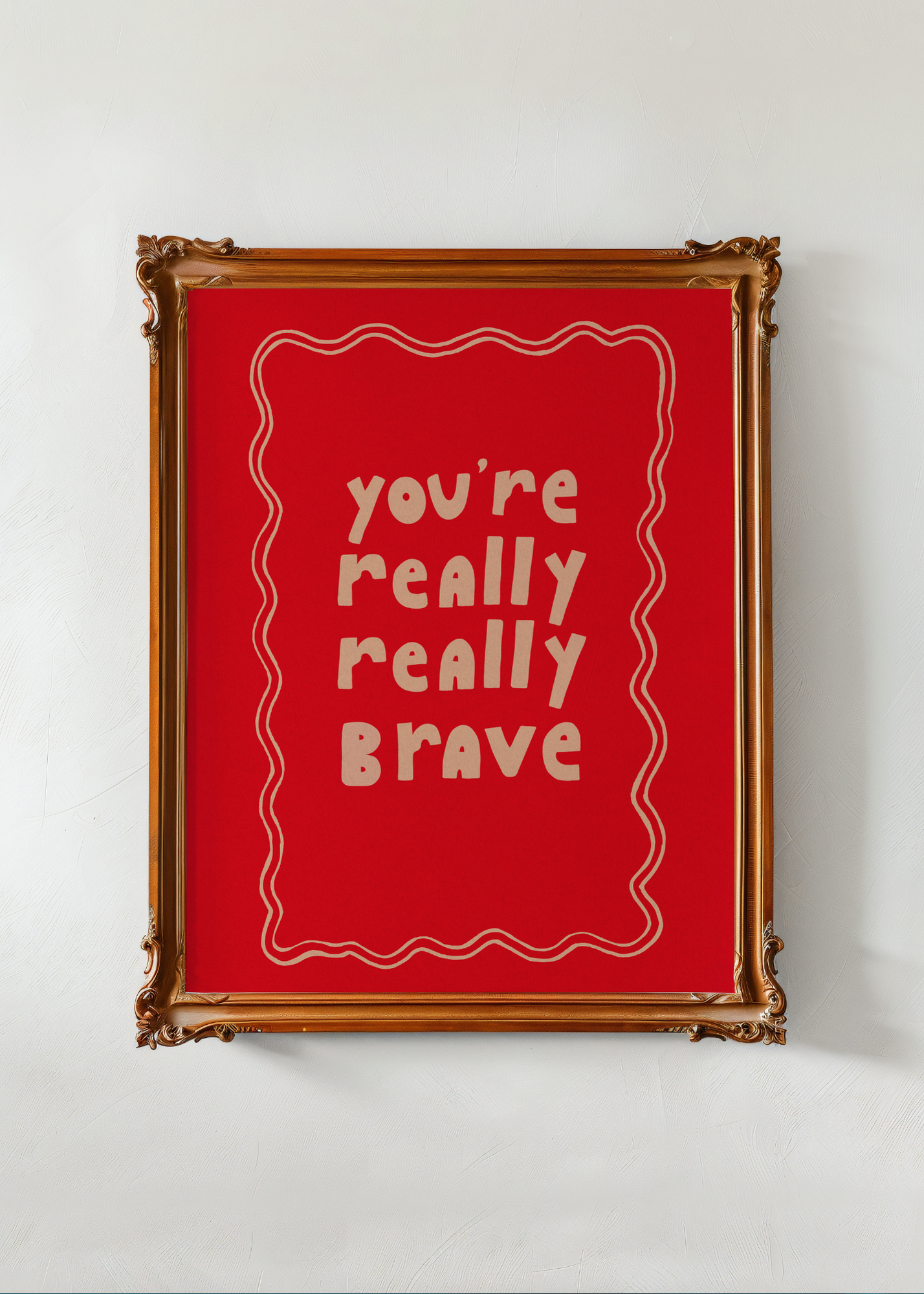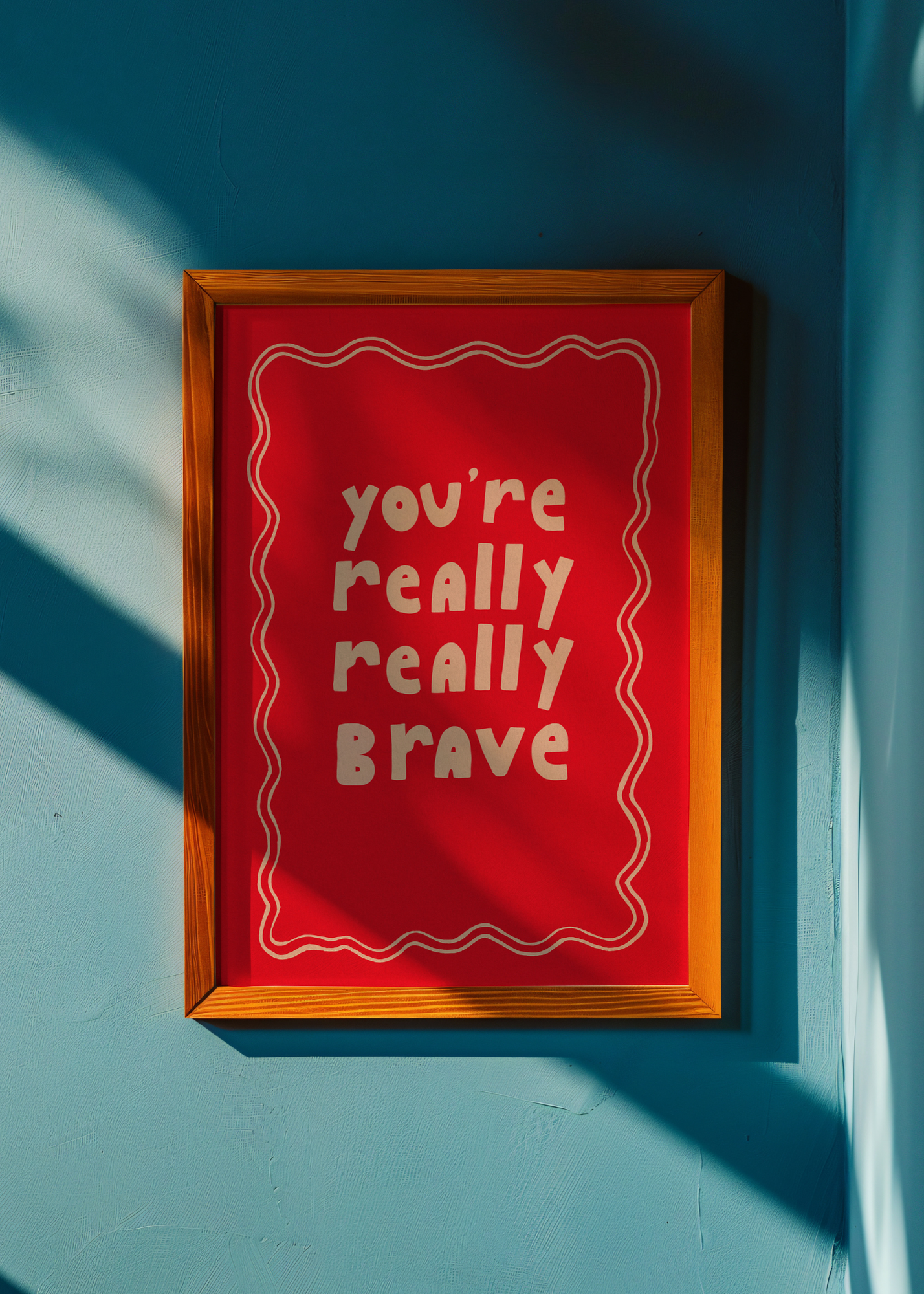 You're Really Brave— Set against a vivid red background, this piece speaks with quiet strength. A hand-drawn white frame loops softly around the words—you’re really, really brave—as if holding them in a steady breath. Bold, simple, and full of heart, it honors the kind of courage that isn’t loud but lasting. A reminder that bravery often looks like simply doing your best and continuing on.
